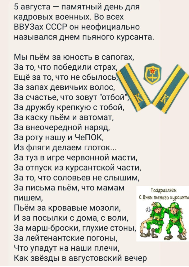 ТЕЛЕГРАММ замедляется.Вероятно скоро его заблокируют.Чтобы не потерять нас и получать оперативно информаци. подпишись на наши каналы в МАХ.Кто еще не подписался В полностью Российской сети МАХ на каналы ВОЕННЫЕ ПЕНСИОНЕРЫ ЗА РОССИЮ И ЕЕ ВООРУЖЕННЫЕ СИЛЫ: Канал для Военных пенсионерах без войны и политики, Военных пенсиях,пенсиях жен военных пенсионеров ,жизни военных пенсионеров и о способах прожить дольше : https://max.ru/voennyepen За Родину .Мы победим.: Оперативная информация О Спецоперации ,политике на канале: https://max.ru/join/aXh9SdoNhgk2rhy901ENolzCyoGLJhMgpon7E6np9n0 СРОЧНО ПОДПИСЫВАЙСЯ и ты будешь в курсе оперативных событий.НЕ пропусти!!! В Телеграмм создана группа " Военные пенсионеры за Россию и ее ВС. Мы победим". У кого есть Телеграмм просим вступить в нее. Там много интересного, срочного, очень оперативная информация, а также чего нельзя помещать в ОДНОКЛАССНИКАХ и на сайте. Вступить можно по ссылке: Военные пенсионеры за Россию и ее ВС. Мы победим "https://t.me/voenpenszaRossiu" Очень большая просьба НЕ ОТПИСЫВАТЬСЯ ОТ КАНАЛА, Канал работает в тестовом режиме. Мы стараемся понять, что Вам будет интересно читать и как работать дальше. Пишите, что бы Вам хотелось читать в ТЕЛЕГРАММ. Хоть в любой теме на сайте, хоть в Телеграмм. Чтобы не раздражали уведомления их можно ОТКЛЮЧИТЬ. Кого раздражают уведомления в Телеграмм их можно отключить. Отключить уведомления можно нажав на надпись ОТКЛЮЧИТЬ УВЕДОМЛЕНИЯ внизу Все слышали про день ВДВ, день ВОЕННО МОРСКОГО ФЛОТА, день ПОГРАНИЧНИКА и т.д. Как правило эти праздники отмечают офицеры, которые имеют к этим военным профессиям непосредственное отношение! Но никто не задумывается про предшественников этих людей, а именно про КУРСАНТОВ! "День курсанта" или "День пьяного курсанта" отмечается 5 августа в связи с тем, что ранее в этот день выходил приказ Министерства Обороны о зачислении в военные училища или переводе учащихся на следующий курс обучения. ![]() | |