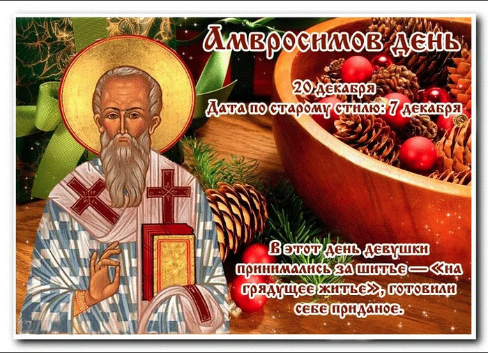 ТЕЛЕГРАММ замедляется.Вероятно скоро его заблокируют.Чтобы не потерять нас и получать оперативно информаци. подпишись на наши каналы в МАХ.Кто еще не подписался В полностью Российской сети МАХ на каналы ВОЕННЫЕ ПЕНСИОНЕРЫ ЗА РОССИЮ И ЕЕ ВООРУЖЕННЫЕ СИЛЫ: Канал для Военных пенсионерах без войны и политики, Военных пенсиях,пенсиях жен военных пенсионеров ,жизни военных пенсионеров и о способах прожить дольше : https://max.ru/voennyepen За Родину .Мы победим.: Оперативная информация О Спецоперации ,политике на канале: https://max.ru/join/aXh9SdoNhgk2rhy901ENolzCyoGLJhMgpon7E6np9n0 СРОЧНО ПОДПИСЫВАЙСЯ и ты будешь в курсе оперативных событий.НЕ пропусти!!! Дата в 2022 году: 20 декабря , вторник Другие названия: Амвросий Церковное название: Святителя Амвросия, епископа Медиоланского Значение: День памяти святого Амвросия Традиции: Подготовка к Рождеству; занятия шитьем, вышивкой; запрещается веселиться Народный праздник Абросимов день отмечается 20 декабря 2022 года (по старому стилю – 7 декабря). В церковном календаре это дата почтения памяти святого Амвросия, епископа Медиоланского. История Амвросий родился в IV веке в городе Тревире (Италия) в семье знатных христиан. Он получил хорошее образование и стал управляющим нескольких провинций в Милане. После смерти отца Амвросий покинул город и переехал в Рим. Повышая свое образование, он начал работать адвокатом, а затем и советником префекта. В 370 году был назначен на должность префекта в городе Медиолане. В 374 году он прошел крещение и занял пост епископа. Амвросий пожертвовал все свое имущество церкви и до самой смерти вел строгий образ жизни. Всю свою жизнь он посвятил борьбе с языческими идолами и арианством. Многим оказал помощь в принятии христианской веры, а полученное образование помогало ему избегать вражды и недопонимания. В 397 году он отошел в иной мир. Традиции и обряды Этот день традиционно накладывает запрет на увеселительные гуляния до Нового года. Жители продолжают подготовку к Рождеству. Женщины убираются в доме, меняют занавески, подметают, проверяют заготовки. Мужчины режут свиней и курей, коптят рыбу, сало и мясо. Незамужние девицы садятся за шитье и вышивку. Существует поверье, что чем красивее будут наряды, тем быстрее на них обратят внимание женихи, и девушка выскочит замуж. Приметы Если стоит ясная погода – жди скорых морозов. Если выпавший снег плотно к изгороди лег, то будущий урожай будет бедным, а если же между изгородью и снегом есть зазоры, то богатым. Погода на Амвросия является зеркальным отражением январской погоды. А следующие 11 дней показывают погоду на следующие месяцы. Так, погода 21 декабря показывает февраль, 22 декабря – март и так далее. Если снег лежит мокрый, то лето будет влажным и дождливым. Если он сухой, то и лето будет сухим. Если солнце прячется в облаках – жди скорого снегопада. Если оно окутано туманным кругом (дымка его застилает), то быть пурге. Если зима выдалась холодной, то быть весне ненастной, а лету знойным, и наоборот. | |