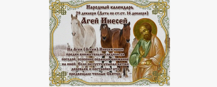 ТЕЛЕГРАММ замедляется.Вероятно скоро его заблокируют.Чтобы не потерять нас и получать оперативно информаци. подпишись на наши каналы в МАХ.Кто еще не подписался В полностью Российской сети МАХ на каналы ВОЕННЫЕ ПЕНСИОНЕРЫ ЗА РОССИЮ И ЕЕ ВООРУЖЕННЫЕ СИЛЫ: Канал для Военных пенсионерах без войны и политики, Военных пенсиях,пенсиях жен военных пенсионеров ,жизни военных пенсионеров и о способах прожить дольше : https://max.ru/voennyepen За Родину .Мы победим.: Оперативная информация О Спецоперации ,политике на канале: https://max.ru/join/aXh9SdoNhgk2rhy901ENolzCyoGLJhMgpon7E6np9n0 СРОЧНО ПОДПИСЫВАЙСЯ и ты будешь в курсе оперативных событий.НЕ пропусти!!! В Телеграмм создана группа " Военные пенсионеры за Россию и ее ВС. Мы победим" .У кого есть Телеграмм просим вступить в нее. Там много интересного ,срочного, чего нельзя помещать в ОДНОСЛАССНИКАХ и На сайте. Вступить можно по ссылке : Военные пенсионеры за Россию и ее ВС.Мы победим : https://t.me/voenpenszaRossiu Дата в 2024 году: 29 декабря , воскресенье Другие названия: Агей, Агей Зимоуказник, Агей Инесей, Аггей-пророк Церковное название: Пророка Аггея Значение: День памяти святого Аггея Традиции: Молитвы о недавно умерших родственниках; подготовка к новогодним праздникам; гадания на погоду Народный праздник Агеев день отмечается 29 декабря 2024 года (по старому стилю – 16 декабря). В церковном календаре это дата почтения памяти святого ветхозаветного пророка Аггея. В простонародье его прозвали Инесеем (Иней Сей), так по инею в этот день судили о погоде на ближайшее время. История В библейских сказаниях информации о пророке Аггее практически не сохранилось. Доподлинно известно, что он был 10-м из 12 малых пророков и проживал в VI веке до н.э. во времена царствования Дария Гистаспа. Он был известен своими смелыми пророчествами в отношении иудейского царя Зоровавеля и первосвященника Исуса. Аггей показывал их бездействие, а также призывал к реставрированию и достройке Иерусалимского храма. Традиции и обряды Пророка Аггея считают покровителем чистой человеческой души. Ей принято помогать вознестись в небесный мир. Для этого после смерти человека закрывают все зеркала, чтобы душа в плен не попала, и открывают окна, двери, чтобы она смогла выбраться наружу. В этот день принято молиться пророку Аггею обо всех недавно погребенных родственниках. Если в семье появился новорожденный, то необходимо прийти в церковь и поставить свечу за здравие ребенка. В молитве также считается обязательным попросить Аггея о сохранении чистоты души младенца и о наставлении его на истинный путь. Продолжается подготовка к новогодним праздникам. Женщины готовят холодцы, сладости для колядующих, а мужчины варят пиво. Традиционно в этот день гадают на погоду. Для этого разжигают костер и бросают в него снежных человечков. Если огонь быстро затухает, значит, выдастся ясная погода на протяжении всех Святок. Приметы Если деревья и дома заковало инеем, то погода на Святки будет теплой. Если в этот день стоит холод, то зима будет лютой. Если снег вплотную у заборов лежит и ветер гуляет, то жди голодного лета (неурожайного). Если стекла покрыли расписные узоры, то мороз продержится еще 20 дней. Агеев день показывает погоду на апрель. | |