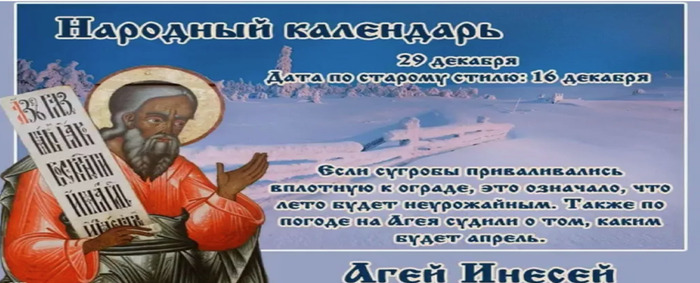 ТЕЛЕГРАММ замедляется.Вероятно скоро его заблокируют.Чтобы не потерять нас и получать оперативно информаци. подпишись на наши каналы в МАХ.Кто еще не подписался В полностью Российской сети МАХ на каналы ВОЕННЫЕ ПЕНСИОНЕРЫ ЗА РОССИЮ И ЕЕ ВООРУЖЕННЫЕ СИЛЫ: Канал для Военных пенсионерах без войны и политики, Военных пенсиях,пенсиях жен военных пенсионеров ,жизни военных пенсионеров и о способах прожить дольше : https://max.ru/voennyepen За Родину .Мы победим.: Оперативная информация О Спецоперации ,политике на канале: https://max.ru/join/aXh9SdoNhgk2rhy901ENolzCyoGLJhMgpon7E6np9n0 СРОЧНО ПОДПИСЫВАЙСЯ и ты будешь в курсе оперативных событий.НЕ пропусти!!! Дата в 2025 году: 29 декабря , понедельник Другие названия: Агей, Агей Зимоуказник, Агей Инесей, Аггей-пророк Церковное название: Пророка Аггея Значение: День памяти святого Аггея Традиции: Молитвы о недавно умерших родственниках; подготовка к новогодним праздникам; гадания на погоду Народный праздник Агеев день отмечается 29 декабря 2025 года (по старому стилю – 16 декабря). В церковном календаре это дата почтения памяти святого ветхозаветного пророка Аггея. В простонародье его прозвали Инесеем (Иней Сей), так по инею в этот день судили о погоде на ближайшее время. История В библейских сказаниях информации о пророке Аггее практически не сохранилось. Доподлинно известно, что он был 10-м из 12 малых пророков и проживал в VI веке до н.э. во времена царствования Дария Гистаспа. Он был известен своими смелыми пророчествами в отношении иудейского царя Зоровавеля и первосвященника Исуса. Аггей показывал их бездействие, а также призывал к реставрированию и достройке Иерусалимского храма. Традиции и обряды Пророка Аггея считают покровителем чистой человеческой души. Ей принято помогать вознестись в небесный мир. Для этого после смерти человека закрывают все зеркала, чтобы душа в плен не попала, и открывают окна, двери, чтобы она смогла выбраться наружу. В этот день принято молиться пророку Аггею обо всех недавно погребенных родственниках. Если в семье появился новорожденный, то необходимо прийти в церковь и поставить свечу за здравие ребенка. В молитве также считается обязательным попросить Аггея о сохранении чистоты души младенца и о наставлении его на истинный путь. Продолжается подготовка к новогодним праздникам. Женщины готовят холодцы, сладости для колядующих, а мужчины варят пиво. Традиционно в этот день гадают на погоду. Для этого разжигают костер и бросают в него снежных человечков. Если огонь быстро затухает, значит, выдастся ясная погода на протяжении всех Святок. Приметы Если деревья и дома заковало инеем, то погода на Святки будет теплой. Если в этот день стоит холод, то зима будет лютой. Если снег вплотную у заборов лежит и ветер гуляет, то жди голодного лета (неурожайного). Если стекла покрыли расписные узоры, то мороз продержится еще 20 дней. Агеев день показывает погоду на апрель. | |