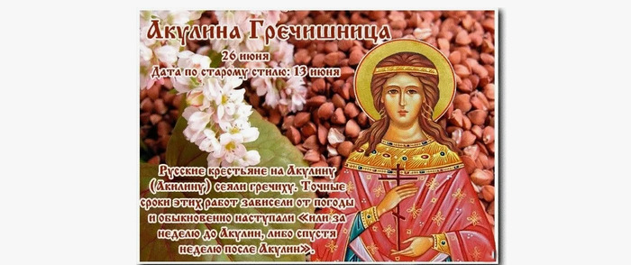 ТЕЛЕГРАММ замедляется.Вероятно скоро его заблокируют.Чтобы не потерять нас и получать оперативно информаци. подпишись на наши каналы в МАХ.Кто еще не подписался В полностью Российской сети МАХ на каналы ВОЕННЫЕ ПЕНСИОНЕРЫ ЗА РОССИЮ И ЕЕ ВООРУЖЕННЫЕ СИЛЫ: Канал для Военных пенсионерах без войны и политики, Военных пенсиях,пенсиях жен военных пенсионеров ,жизни военных пенсионеров и о способах прожить дольше : https://max.ru/voennyepen За Родину .Мы победим.: Оперативная информация О Спецоперации ,политике на канале: https://max.ru/join/aXh9SdoNhgk2rhy901ENolzCyoGLJhMgpon7E6np9n0 СРОЧНО ПОДПИСЫВАЙСЯ и ты будешь в курсе оперативных событий.НЕ пропусти!!! В Телеграмм создана группа " Военные пенсионеры за Россию и ее ВС. Мы победим". У кого есть Телеграмм просим вступить в нее. Там много интересного, срочного, очень оперативная информация, а также чего нельзя помещать в ОДНОКЛАССНИКАХ и на сайте. Вступить можно по ссылке: Военные пенсионеры за Россию и ее ВС. Мы победим "https://t.me/voenpenszaRossiu" Очень большая просьба НЕ ОТПИСЫВАТЬСЯ ОТ КАНАЛА, Канал работает в тестовом режиме. Мы стараемся понять, что Вам будет интересно читать и как работать дальше. Пишите, что бы Вам хотелось читать в ТЕЛЕГРАММ. Хоть в любой теме на сайте, хоть в Телеграмм. Чтобы не раздражали уведомления их можно ОТКЛЮЧИТЬ. Кого раздражают уведомления в Телеграмм их можно отключить. Отключить уведомления можно нажав на надпись ОТКЛЮЧИТЬ УВЕДОМЛЕНИЯ внизу Дата в 2025 году: 26 июня , четверг Другие названия: Акулина; Акилина; Акилина Гречишница; Акилина-гресушница; Акулина-гречушницы; гречушницы; Акулина – черные гречихи; Акулина-комарница; черные грачи; Акулина – задери (вздерни, вздери) хвосты; вздери хвосты; Акулина-быза; Акулины базы; Акулины-бызы; Акулина – кривые огурцы; дрок; строка; праздник каш; начало лета; Окулинин день Церковное название: Мученицы Акилины Старшей Значение: День памяти Акилины Старшей, Библосской (Финикийской) Традиции: Посев гречки; приготовление гречневой (мирской) каши Народный праздник Акулина Гречишница отмечается 26 июня 26 июня года (по старому стилю – 13 июня). В православном календаре это дата почтения памяти мученицы Акилины Старшей, Библосской (Финикийской). «Гречишницей» народ назвал праздник потому, что в эту пору на Руси с давних пор принято сеять гречиху. Еще одно название дня – «задери хвосты» – пошло из-за нашествия мух, комаров, оводов в этот период и отмахивания домашней скотины хвостами от этой напасти. История Акилина родилась в 281 году в финикийском городе Библосе. Ее родители были набожными христианами. В шесть месяцев они крестили девочку. Когда ей исполнилось два года, отец скоропостижно умер. На протяжении следующих пяти лет девочка впитывала наставления матери о благочестивой жизни. К десяти годам она решила посвятить всю себя служению Господу. Когда Акилине исполнилось 12 лет, на нее донесли правителю области Волусиану. В то время империя была во власти язычников Максимиана и Диоклетиана – жестоких преследователей христиан. Волусиан сначала уговорами, а затем угрозами заставлял девочку отречься от веры. Акилина перенесла все побои и мужественно приняла первую смерть от раскаленных прутов, которыми ей просверлили голову. Ночью у брошенного под стеной города тела появился ангел и, прикоснувшись к девочке, повелел ей встать. Излечившаяся от всех ран мученица пришла 