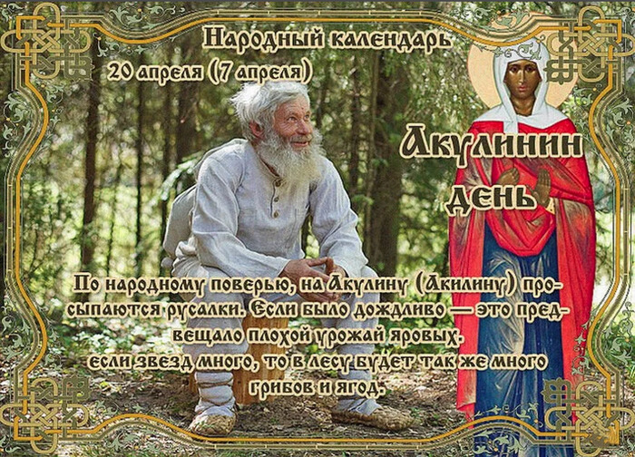 ТЕЛЕГРАММ замедляется.Вероятно скоро его заблокируют.Чтобы не потерять нас и получать оперативно информаци. подпишись на наши каналы в МАХ.Кто еще не подписался В полностью Российской сети МАХ на каналы ВОЕННЫЕ ПЕНСИОНЕРЫ ЗА РОССИЮ И ЕЕ ВООРУЖЕННЫЕ СИЛЫ: Канал для Военных пенсионерах без войны и политики, Военных пенсиях,пенсиях жен военных пенсионеров ,жизни военных пенсионеров и о способах прожить дольше : https://max.ru/voennyepen За Родину .Мы победим.: Оперативная информация О Спецоперации ,политике на канале: https://max.ru/join/aXh9SdoNhgk2rhy901ENolzCyoGLJhMgpon7E6np9n0 СРОЧНО ПОДПИСЫВАЙСЯ и ты будешь в курсе оперативных событий.НЕ пропусти!!! Дата в 2023 году: 20 апреля , четверг Другие названия: Акулина; День Акулины Церковное название: Мученицы Акилины Значение: Почтение памяти святой Акилины Традиции: Подарки для русалок на берегу реки Народный праздник Акулинин день отмечается 20 апреля 2023 года (по старому стилю – 7 апреля). В православном церковном календаре это дата почтения памяти мученицы Акилины. История Акилина жила в городе Синопе. Когда при императоре Максимиане начались гонения на христиан, диакона Руфина, с которым она была знакома, заточили в темницу по обвинению в исповедании православной веры. Акилина приходила к нему, всячески поддерживала и заботилась о том, чтобы он не пал духом. За это ее также арестовали. В заточении Акилина и Руфин, каждый со своей стороны, не прекратили вести проповеди и многими чудесами смогли обратить в христианскую веру 200 солдат. Об этом донесли правителю. Он приказал обезглавить Акилину, диакона Руфина и всех новообращенных воинов. Так святая приняла мученическую смерть во имя Иисуса Христа. Традиции и обряды В Акулинин день, по народному поверью, на поверхность рек выходят русалки. Этих водяных духов можно встретить не только у водоемов, но и в поле или лесу. Осенью они уходят под воду и проводят в пучине все зимние месяцы. Истории известны случаи, когда русалок ловили и «одомашнивали». Правда, ненадолго, потому что эти существа питаются паром, без воды долго не могут существовать и вскоре растворяются без следа. Для того чтобы оградить свою семью от подобной встречи, женщины 20 апреля ходят к реке и оставляют на берегу подарки для русалок: платья, юбки, рубахи и красивые лоскуты материи. Считается, если русалка примет подношения, то на протяжении всего года она не тронет никого из семьи. Перед тем как идти к воде, обязательно берут с собой полынь (русалки ее не любят) или чеснок, который отпугивает всякую нечистую силу. Если этого не сделать, то водяные девицы могут защекотать до смерти. Одна из легенд о русалках гласит, что водяные духи распевают свои песни и водят хороводы на берегу только в темное время. Днем они превращаются в кувшинки. Таким образом русалки защищаются от солнца. Поэтому срывать кувшинки нельзя, чтобы не навлечь беду за оборванную жизнь. Приметы Если долго идет ливень, значит, не стоит рассчитывать на урожай яровых и калины. Заморозок в предрассветный час и ясное небо на рассвете сулят много гречки и зерновых. На Акулинин день пошел дождь, значит, будет много малины. Если ночью небо яркое от звезд, то будет много грибов и ягод в лесу. Нельзя смотреть на улицу через окно, тем более в ночное время – иначе можно накликать несчастье. | |