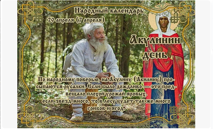 ТЕЛЕГРАММ замедляется.Вероятно скоро его заблокируют.Чтобы не потерять нас и получать оперативно информаци. подпишись на наши каналы в МАХ.Кто еще не подписался В полностью Российской сети МАХ на каналы ВОЕННЫЕ ПЕНСИОНЕРЫ ЗА РОССИЮ И ЕЕ ВООРУЖЕННЫЕ СИЛЫ: Канал для Военных пенсионерах без войны и политики, Военных пенсиях,пенсиях жен военных пенсионеров ,жизни военных пенсионеров и о способах прожить дольше : https://max.ru/voennyepen За Родину .Мы победим.: Оперативная информация О Спецоперации ,политике на канале: https://max.ru/join/aXh9SdoNhgk2rhy901ENolzCyoGLJhMgpon7E6np9n0 СРОЧНО ПОДПИСЫВАЙСЯ и ты будешь в курсе оперативных событий.НЕ пропусти!!! В Телеграмм создана группа " Военные пенсионеры за Россию и ее ВС. Мы победим". У кого есть Телеграмм просим вступить в нее. Там много интересного, срочного, очень оперативная информация, а также чего нельзя помещать в ОДНОКЛАССНИКАХ и на сайте. Вступить можно по ссылке: Военные пенсионеры за Россию и ее ВС. Мы победим "https://t.me/voenpenszaRossiu" Очень большая просьба НЕ ОТПИСЫВАТЬСЯ ОТ КАНАЛА, Канал работает в тестовом режиме. Мы стараемся понять, что Вам будет интересно читать и как работать дальше. Пишите, что бы Вам хотелось читать в ТЕЛЕГРАММ. Хоть в любой теме на сайте, хоть в Телеграмм. Чтобы не раздражали уведомления их можно ОТКЛЮЧИТЬ. Кого раздражают уведомления в Телеграмм их можно отключить. Отключить уведомления можно нажав на надпись ОТКЛЮЧИТЬ УВЕДОМЛЕНИЯ внизу Дата в 2025 году: 20 апреля , воскресенье Другие названия: Акулина; День Акулины Церковное название: Мученицы Акилины Значение: Почтение памяти святой Акилины Традиции: Подарки для русалок на берегу реки Народный праздник Акулинин день отмечается 20 апреля 2025 года (по старому стилю – 7 апреля). В православном церковном календаре это дата почтения памяти мученицы Акилины. Содержание статьи История Акилина жила в городе Синопе. Когда при императоре Максимиане начались гонения на христиан, диакона Руфина, с которым она была знакома, заточили в темницу по обвинению в исповедании православной веры. Акилина приходила к нему, всячески поддерживала и заботилась о том, чтобы он не пал духом. За это ее также арестовали. В заточении Акилина и Руфин, каждый со своей стороны, не прекратили вести проповеди и многими чудесами смогли обратить в христианскую веру 200 солдат. Об этом донесли правителю. Он приказал обезглавить Акилину, диакона Руфина и всех новообращенных воинов. Так святая приняла мученическую смерть во имя Иисуса Христа. Традиции и обряды В Акулинин день, по народному поверью, на поверхность рек выходят русалки. Этих водяных духов можно встретить не только у водоемов, но и в поле или лесу. Осенью они уходят под воду и проводят в пучине все зимние месяцы. Истории известны случаи, когда русалок ловили и «одомашнивали». Правда, ненадолго, потому что эти существа питаются паром, без воды долго не могут существовать и вскоре растворяются без следа. Для того чтобы оградить свою семью от подобной встречи, женщины 20 апреля ходят к реке и оставляют на берегу подарки для русалок: платья, юбки, рубахи и красивые лоскуты материи. Считается, если русалка примет подношения, то на протяжении всего года она не тронет никого из семьи. Перед тем как идти к воде, обязательно берут с собой полынь (русалки ее не любят) или чеснок, который отпугивает всякую нечистую силу. Если этого не сделать, 