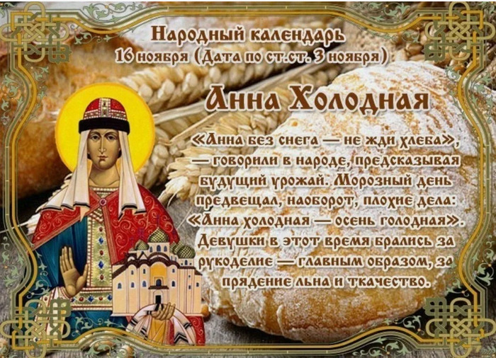 ТЕЛЕГРАММ замедляется.Вероятно скоро его заблокируют.Чтобы не потерять нас и получать оперативно информаци. подпишись на наши каналы в МАХ.Кто еще не подписался В полностью Российской сети МАХ на каналы ВОЕННЫЕ ПЕНСИОНЕРЫ ЗА РОССИЮ И ЕЕ ВООРУЖЕННЫЕ СИЛЫ: Канал для Военных пенсионерах без войны и политики, Военных пенсиях,пенсиях жен военных пенсионеров ,жизни военных пенсионеров и о способах прожить дольше : https://max.ru/voennyepen За Родину .Мы победим.: Оперативная информация О Спецоперации ,политике на канале: https://max.ru/join/aXh9SdoNhgk2rhy901ENolzCyoGLJhMgpon7E6np9n0 СРОЧНО ПОДПИСЫВАЙСЯ и ты будешь в курсе оперативных событий.НЕ пропусти!!! Дата в 2023 году: 16 ноября , четверг Другие названия: Анна, Бабы Церковное название: Святой княжны Анны Всеволодовны Значение: Почтение памяти святой Анны, дочери киевского князя Всеволода Традиции: Прядение, ткачество Народный праздник Анна Холодная отмечается 16 ноября 2023 года (дата по старому стилю – 3 ноября). Верующие православной церкви в этот день чтут память святой княжны Анны Всеволодовны. В простонародье ее прозвали Холодной, так как погода в данный период начинает меняться, наступают холода, и зима вступает в свои права. История Анна (Янка) Всеволодовна родилась в 1054 году в городе Переяславле, где и провела все свое детство. Ее родителями были великий князь киевский Всеволод Ярославович и греческая царевна. Отец дал ей княжеское воспитание: она была обучена грамоте, философии, истории, риторике, греческому языку. Став прекрасной девицей, была обручена с византийским царевичем Дукой Старшим. Когда ее суженого насильно постригли в монахи, она решила посвятить себя Господу Богу. Посетив Византию, осмотрела женские монастыри и стала упрашивать отца и митрополита Иоанна II основать такую же обитель на Руси. В 1068 году был поставлен первый женский монастырь – Андреевский, в котором Анна и стала игуменьей. В нем была открыта первая на Руси школа для девочек, в которой, помимо необходимых основ, преподавали и различные женские ремесла. После смерти митрополита Анна Всеволодовна сама участвовала в направлении в Русскую церковь нового владыки из Византии. Традиции и обряды В этот день по традиции женщины занимаются рукоделием, садятся за пряжу и холсты. Приметы Если на Анну Холодную не выпадет снег – быть ближайшему году неурожайным. Если облака низко летят – жди холода. Горящие в печи ярко и с треском дрова предвещают мороз, а если они плохо разгораются – быть теплу. Если днем стоит холодная погода, то осенью будет голодно. Дым из трубы низко стелется – к потеплению, а если поднимается вверх – к морозу. Ели вынесенный на улицу испеченный хлеб замерзнет, то вскоре ударят морозы. Сайт существует только благодаря Вам ,посетители и пользователи сайта.Кто хочет помочь сайту добровольно, перечислите деньги в сумме от 1 рубля на карту 4006800071005382 . Любая помощь в любом объеме поможет сайту выжить. Для перевода воспользуйтесь услугой Вашего банка онлайн через приложение или сходите в банк. Спасибо всем кто помогает сайту выжить !!! | |