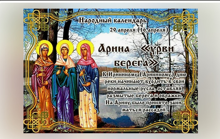 ТЕЛЕГРАММ замедляется.Вероятно скоро его заблокируют.Чтобы не потерять нас и получать оперативно информаци. подпишись на наши каналы в МАХ.Кто еще не подписался В полностью Российской сети МАХ на каналы ВОЕННЫЕ ПЕНСИОНЕРЫ ЗА РОССИЮ И ЕЕ ВООРУЖЕННЫЕ СИЛЫ: Канал для Военных пенсионерах без войны и политики, Военных пенсиях,пенсиях жен военных пенсионеров ,жизни военных пенсионеров и о способах прожить дольше : https://max.ru/voennyepen За Родину .Мы победим.: Оперативная информация О Спецоперации ,политике на канале: https://max.ru/join/aXh9SdoNhgk2rhy901ENolzCyoGLJhMgpon7E6np9n0 СРОЧНО ПОДПИСЫВАЙСЯ и ты будешь в курсе оперативных событий.НЕ пропусти!!! Дата в 2024 году: 29 апреля , понедельник Другие названия: Арина (Ирина); Водоноска; Ирины-рассадницы; Ирина – развороши (урви) снега; Ирина – заиграй (разрой) овраги; Ирина – разбей (разрой) берега Церковное название: Мучениц Агапии, Ирины и Хионии Значение: Почтение памяти трех сестер – мучениц Солунских Традиции: Высаживание рассады; побелка деревьев; отворотные заговоры Народный праздник Арина – урви берега отмечается 29 апреля 2024 года (дата по старому стилю – 16 апреля). Православной церковью в этот день чтится память мученицы Ирины и ее двух сестер. Название праздника несет в себе напоминание об опасности берегов в этот период. Подмытые половодьем, они могут обрушиться. В это время реки входят в свои обычные берега, оставляя после себя размолотые мосты и развороченные овраги. История Ирина вместе со старшими сестрами жила в предместье итальянского города Аквилеи в конце III – начале IV столетий. Рано осталась без родителей. Вместе с сестрами посвятила свою жизнь православной вере. Однажды духовному наставнику семьи в дреме было дано видение, что он скоро умрет, а Ирину и сестер схватят язычники. После его смерти откровение исполнилось. Девушки предстали перед императором Диоклетианом. Их обвинили в отказе подношения жертв языческим богам. Императору стало жаль красивых девушек. Он предложил им отказаться от своего бога. За это обещал найти им богатых женихов. Девушки ответили, что являются невестами Христа, и за веру готовы пойти на муки. После этого Диоклетиан передал сестер на суд правителя Дуклиция. Тот также не смог совладать с девушками. Дело передали судье Сисинию. Он приговорил старших сестер к сожжению, а младшей, Ирине, пригрозил блудным домом. Девушка и тут не отступила. Она сказала, что душа ее не будет осквернена, даже если тело окажется насильственно поруганным. Когда ее вели в блудилище, к охране подбежали два воина и передали приказ судьи Сисиния доставить девушку на гору и доложить ему. Этими воинами были Ангелы. Судья со стражниками приехал к горе. Но они не нашли тропы к вершине, на которой с улыбкой на лице стояла Ирина. Тогда солдат выстрелил из лука и поразил мученицу. Традиции и обряды На Арину работают в саду и огороде. Белят стволы деревьев. Сеют гречиху. Высаживают в специальные ящики-срубы рассаду капусты и помидор. По народным приметам, дни после Арины обычно солнечные и теплые, что хорошо для молодых культур. В этот народный праздник читают отворотные заговоры для разлуки мужа с соперницей. Приметы На ольхе распустились цветы – настала пора засевать гречиху. «Запылала» лещина, значит, можно сажать лес. На Арину пора выжигать траву в поле. Слышать во сне колокольный звон – к пожару. | |