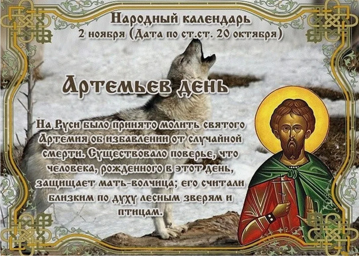 ТЕЛЕГРАММ замедляется.Вероятно скоро его заблокируют.Чтобы не потерять нас и получать оперативно информаци. подпишись на наши каналы в МАХ.Кто еще не подписался В полностью Российской сети МАХ на каналы ВОЕННЫЕ ПЕНСИОНЕРЫ ЗА РОССИЮ И ЕЕ ВООРУЖЕННЫЕ СИЛЫ: Канал для Военных пенсионерах без войны и политики, Военных пенсиях,пенсиях жен военных пенсионеров ,жизни военных пенсионеров и о способах прожить дольше : https://max.ru/voennyepen За Родину .Мы победим.: Оперативная информация О Спецоперации ,политике на канале: https://max.ru/join/aXh9SdoNhgk2rhy901ENolzCyoGLJhMgpon7E6np9n0 СРОЧНО ПОДПИСЫВАЙСЯ и ты будешь в курсе оперативных событий.НЕ пропусти!!! Дата в 2023 году: 2 ноября , четверг Другие названия: Артемий; День атаманов Церковное название: Великомученика Артемия Антиохийского Значение: Почтение памяти военачальника Артемия Традиции: Пиршества для атаманов 2 ноября 2023 года (20 октября – дата по старому стилю) отмечается народный праздник памяти святого великомученика Артемия Антиохийского. Военачальник Артемий состоял в IV веке на службе у императора Константина Великого, а впоследствии и его сына – преемника Констанция. За отличную работу он был назначен наместником Египта. После смерти правителей на смену им пришел Юлиан, прозванный Отступником. Он хотел вернуть язычество и начал гонения на христиан, беспощадно подвергая их казни. В одном из городов Юлиан подверг пыткам 2-х епископов за их нежелание отречься от христианской веры. Артемий, находясь в том же населенном пункте, раскритиковал его действия и всенародно обличил императора. За это он был схвачен и подвержен мучительным пыткам. Брошенный в темницу Артемий начал усердно молиться. Ему явился Господь Бог и поведал, что убережет его от всяческой боли. На следующий день он был снова подвергнут жестким пыткам, но не издал ни одного стона. Лишь однажды он произнес, что вскоре император получит возмездие за все беды, причиненные христианам. Разъяренный Юлиан велел отрубить голову Артемию. Его останки захоронили христиане, а после сбывшегося пророчества – смерти Юлиана тело святого было переправлено силами диаконисы Антиохийской Арисы в Константинополь. Традиции и обряды Существовало поверье, что дети, рожденные в этот день, имеют особых защитников – волчиц. Они могут понимать язык птиц и зверей. Считалось, что мольбы в Артемьев день могут избавить воинов от нелепой смерти. В этот день организовывали пиршества для атаманов, предводителей других рангов и их дружин. Приметы Если волки начали выть в Артемьев день, то приближаются морозы. Если белки прячут много орехов, то зима будет холодной. Если с утра иней покрывает деревья – ждите плохого урожая. Если волки близко подходят к домам и воют, то зима будет голодной, а лето неурожайным. Сайт существует только благодаря Вам ,посетители и пользователи сайта. Кто хочет помочь сайту добровольно, перечислите деньги в сумме от 1 рубля на карту 4006800071005382 . Любая помощь в любом объеме поможет сайту выжить. Для перевода воспользуйтесь услугой Вашего банка онлайн через приложение или сходите в банк. Спасибо всем кто помогает сайту выжить !!! | |