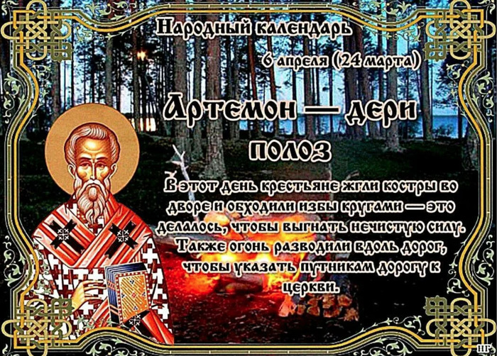 ТЕЛЕГРАММ замедляется.Вероятно скоро его заблокируют.Чтобы не потерять нас и получать оперативно информаци. подпишись на наши каналы в МАХ.Кто еще не подписался В полностью Российской сети МАХ на каналы ВОЕННЫЕ ПЕНСИОНЕРЫ ЗА РОССИЮ И ЕЕ ВООРУЖЕННЫЕ СИЛЫ: Канал для Военных пенсионерах без войны и политики, Военных пенсиях,пенсиях жен военных пенсионеров ,жизни военных пенсионеров и о способах прожить дольше : https://max.ru/voennyepen За Родину .Мы победим.: Оперативная информация О Спецоперации ,политике на канале: https://max.ru/join/aXh9SdoNhgk2rhy901ENolzCyoGLJhMgpon7E6np9n0 СРОЧНО ПОДПИСЫВАЙСЯ и ты будешь в курсе оперативных событий.НЕ пропусти!!! Дата в 2022 году: 6 апреля , среда Другие названия: Артемон; Артемий; Канун Благовещения Церковное название: Святителя Артемона (Артемия), епископа Солунского Значение: Почтение памяти святого Артемона (Артемия) Солунского (Селевкийского) Традиции: Освящение семян; обряд изгнания нечистых сил Народный праздник Артемон – дери полоз отмечается 6 апреля 2022 года (по старому стилю – 24 марта). Православной церковью в этот день чтится память святого Артемона (Артемия) Солунского (Селевкийского), епископа. Название праздника «дери полоз» пошло со времен, когда машин не было, и люди ездили на санях и телегах. Тот, кто не удосужился подготовить к этому сроку телегу и все еще ездил на санях, рисковал ободрать полозья на подтаявшем снегу. История В древних славянских церковных книгах «Селевкийский» писалось как «Селеоукинский». Поэтому произошла путаница, и появилось слово «Селоунский». В древнегреческих документах святой назван Солунским. В XVII столетии ошибочно решили, что речь идет о разных людях. О святом Артемоне известно мало. Он родился и жил в городе Селевкии Писидийской (Малая Азия). Был набожным и нравственным христианином. За это святой апостол Павел, во время посещения тех мест, назначил его первым епископом города. Апостол посчитал, что нет человека достойнее, и не ошибся. Всю оставшуюся жизнь святитель Артемон посвятил служению Господу и мудрому управлению вверенным ему приходом. Более того, он яро защищал бедных и гонимых, за что люди почитали его как заступника обездоленных. Умер епископ в глубокой старости. Традиции и обряды На следующий день после Артемона празднуется большой православный праздник – Благовещение, в который нельзя работать. Поэтому 6 апреля люди стараются переделать все дела. Тем, у кого есть огород, нужно успеть еще сходить в церковь на службу, посвятить семена. Считается, что освященные семена дадут хороший урожай. В этот народный праздник проводят обряд изгнания нечистых сил. Разводят костры во дворах и с горящими палками обходят дома и постройки. Делают это ближе к вечеру, ведь костер – не только очищающий огонь, но и красивое зрелище. Запаливают его возле церквей и на дорогах в глухих районах, для того чтобы поздний путник не заблудился. Приметы и поверья Утренняя роса – к хорошему урожаю проса. Пошел снег – уродится гречиха. Если за окном резко потеплело, значит, грядут морозы. Но они будут недолгими, а лето наступит очень быстро. Если 6 апреля растает последний снег, то до зимы новый уже не выпадет. Чтобы узнать, будет ли год урожайным, нужно в ночь на 7 апреля вывесить на улицу мокрое полотенце. Если до восхода оно высохнет, значит, урожай будет обильным. Если девушка отстоит всенощную службу, то ее 