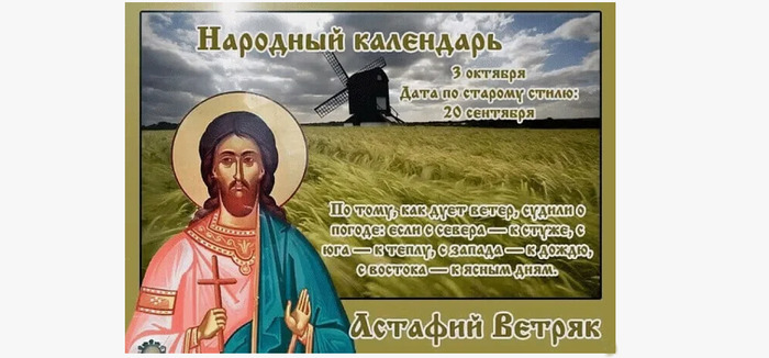 ТЕЛЕГРАММ замедляется.Вероятно скоро его заблокируют.Чтобы не потерять нас и получать оперативно информаци. подпишись на наши каналы в МАХ.Кто еще не подписался В полностью Российской сети МАХ на каналы ВОЕННЫЕ ПЕНСИОНЕРЫ ЗА РОССИЮ И ЕЕ ВООРУЖЕННЫЕ СИЛЫ: Канал для Военных пенсионерах без войны и политики, Военных пенсиях,пенсиях жен военных пенсионеров ,жизни военных пенсионеров и о способах прожить дольше : https://max.ru/voennyepen За Родину .Мы победим.: Оперативная информация О Спецоперации ,политике на канале: https://max.ru/join/aXh9SdoNhgk2rhy901ENolzCyoGLJhMgpon7E6np9n0 СРОЧНО ПОДПИСЫВАЙСЯ и ты будешь в курсе оперативных событий.НЕ пропусти!!! Астафий Ветряк — народный праздник, который отмечается 3 октября. В этот день православные верующие вспоминают христианского святого и великомученика Евстафия Римского, в честь которого и прозван этот день. 1 Традиции на Астафия Ветряка: Проветривание одежды и постельного белья на улице. Считается, что ветром выдует все горести и нечистую силу, неудач и проблем станет меньше. 3 Мытьё окон и зеркал святой водой — для защиты жилища от проникновения нечисти. 3 Сон в ночь на 3 октября чаще всего предвещает положительные перемены и события. Если привиделось плохое сновидение, то оно заберёт с собой что-то дурное из реальной жизни. 3 Народные приметы на 3 октября: Северный ветер — к морозу. 3 Южный ветер — к тёплой погоде, к хорошему урожаю озимых. 3 Западный ветер — дождь принесёт. 3 Восточный ветер — день будет ясный. 3 Северо-западный — к дождям и сильному похолоданию. 3 Нет ветра — может пойти снег. 3 Тёплый день — осень окажется затяжная. 3 Паутина летит — до первого снега ещё долго. 3 Еловые шишки на нижних ветвях выросли — к раннему морозу. 3 Много шишек именно на верхушке ели — сильные холода придут в конце зимы. | |