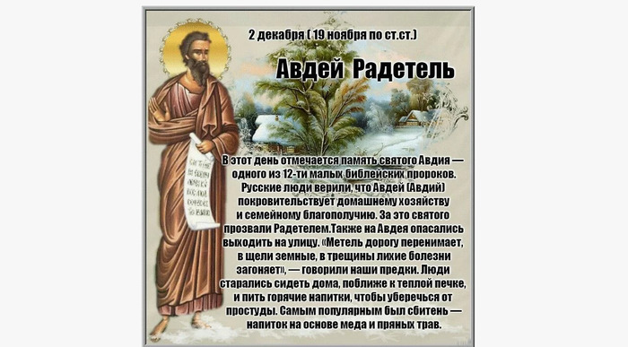 ТЕЛЕГРАММ замедляется.Вероятно скоро его заблокируют.Чтобы не потерять нас и получать оперативно информаци. подпишись на наши каналы в МАХ.Кто еще не подписался В полностью Российской сети МАХ на каналы ВОЕННЫЕ ПЕНСИОНЕРЫ ЗА РОССИЮ И ЕЕ ВООРУЖЕННЫЕ СИЛЫ: Канал для Военных пенсионерах без войны и политики, Военных пенсиях,пенсиях жен военных пенсионеров ,жизни военных пенсионеров и о способах прожить дольше : https://max.ru/voennyepen За Родину .Мы победим.: Оперативная информация О Спецоперации ,политике на канале: https://max.ru/join/aXh9SdoNhgk2rhy901ENolzCyoGLJhMgpon7E6np9n0 СРОЧНО ПОДПИСЫВАЙСЯ и ты будешь в курсе оперативных событий.НЕ пропусти!!! Спасибо всем неравнодушным .Деньги для сайта собрали .Для запасного сайта Военный пенсионер.рф необходимо еще 1700 руб дособрать. Но это не критично. Если кто хочет помочь,то мы будем очень благодарны. карта : 4006800071005382 Еще раз спасибо всем кто прислал и 1 руб и 3000 руб они помогли сайту выжить !!!! Дата в 2024 году: 2 декабря , понедельник Другие названия: Авдей (Авдий); Авдеев день; день Авдия Радетеля Церковное название: Пророка Авдия (из 12-ти) Значение: День памяти одного из 12 малых пророков – Авдия Традиции: Защита дома от нечистой силы Народный праздник Авдей Радетель отмечается 2 декабря 2024 года (дата по старому стилю – 19 ноября). В православном календаре это день памяти святого Авдия, одного из 12-ти малых пророков. В народе он считается небесным покровителем домашнего очага, хозяйства и благополучия, за что и был прозван «Радетелем», что значит «беспокоящийся», «переживающий». История Будущий пророк Авдий родился в деревне близ Сихема. С юных лет он познал Бога и служил Ему верой и правдой. В то время как в Израиле решили поклоняться Баалу, Авдий не поддался народным веяниям и остался верен Истинному Богу. Он был домоправителем в доме самого царя Ахава. Когда жена правителя решила устроить гонения на пророков, Авдий оставил работу и стал помогать христианам. Встретив пророка Илию, он последовал за ним и был награжден за дела и мысли даром предсказания. После себя Авдий оставил книгу пророчеств. Она содержит всего одну главу, но стоит четвертой в списке книг малых пророков. Традиции и обряды В этот праздник проводится обряд «запирания» жилища от нечистой силы. Для этого нужно пройти по всему дому, постукивая по косякам дверей и рамам окон обухом топора. Если топора не оказалось под рукой, подойдет серп. Согласно преданию, это оградит не только дом, но и всех живущих в нем от происков темных сил. Часто на Авдея Радетеля на улице бушует зима и гуляют сильные ветры. В такие моменты говорят, что нечисть буйствует, и лучше провести день дома, в тепле, с горячим или горячительным, что кому ближе по душе, напитком. Наиболее популярным питьем этого времени года является травяной чай с медом. Приметы Намело большие сугробы – в следующем году быть хорошему урожаю. Ясный день – к морозам, пасмурный – к теплу. Коровы нос из яслей выставляют, значит, погода изменится. Сильный ветер и снег весь день – зима будет долгой, а весна холодной. | |