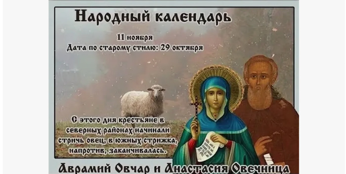 ТЕЛЕГРАММ замедляется.Вероятно скоро его заблокируют.Чтобы не потерять нас и получать оперативно информаци. подпишись на наши каналы в МАХ.Кто еще не подписался В полностью Российской сети МАХ на каналы ВОЕННЫЕ ПЕНСИОНЕРЫ ЗА РОССИЮ И ЕЕ ВООРУЖЕННЫЕ СИЛЫ: Канал для Военных пенсионерах без войны и политики, Военных пенсиях,пенсиях жен военных пенсионеров ,жизни военных пенсионеров и о способах прожить дольше : https://max.ru/voennyepen За Родину .Мы победим.: Оперативная информация О Спецоперации ,политике на канале: https://max.ru/join/aXh9SdoNhgk2rhy901ENolzCyoGLJhMgpon7E6np9n0 СРОЧНО ПОДПИСЫВАЙСЯ и ты будешь в курсе оперативных событий.НЕ пропусти!!! Удивляюсь я : пенсию получили ,на сайт ходит много народу и жалко 1 рубля, что бы сайт существовал? Дело идет к закрытию сайта,2-х групп на ОДНОКЛАССНИКАХ и запасного сайта. Основной массе военпенсов как всегда Все равно. Как боялись поддержать обращения к Власти да и всего военпенсы боятся. Бог Вам судья Сбор добровольных пожертвований идет очень медленно. Дело идет к закрытию сайта. Нам важна любая помощь .Для продолжения работы сайта необходимы деньги. Если не сможем собрать 16800 руб до 15 декабря придется закрыть сайт.Кто хочет помочь сайту добровольно, перечислите деньги в сумме от 1 рубля на карту 4006800071005382 Деньги перечислить можно через мобильное приложение Вашего банка , можно обратиться в банк или через банкомат .Информация о количестве собранных денег будет публиковаться регулярно .Как насобираем необходимую сумму сбор пожертвований для оплаты сайта будет прекращен . Дата в 2024 году: 11 ноября , понедельник Другие названия: Анастасия-Овчарница, Настасья-Стригальница, Овечница, Овчарный праздник; Анастасия-узорешительница, Авраамий и Настасья Церковное название: Преподобного Аврамия затворника и блаженной Марии, племянницы его; Преподобномученицы Анастасии Римляныни Значение: День памяти святых Аврамия и его племянницы; мученицы Анастасии Традиции: Овчарный праздник; стрижка овец Народный праздник Аврамий Овчар и Анастасия Овечница отмечается 11 ноября 2024 года (дата по старому стилю – 29 октября). Верующие русской православной церкви в этот день чтут память преподобной мученицы Анастасии Римляныни и преподобного Аврамия затворника. В простонародье их прозвали Овчаром и Овечницей, так как считается, что они оберегают отары овец и покровительствуют пастухам. История Анастасия Римляныня похоронила родителей, когда ей исполнилось 3 года. Не имея родственников, она была взята на воспитание в монастырь, где и приняла иночество. Когда ей исполнился 21 год, у власти был император Декий. Слава о красоте Анастасии распространилась по Риму. Ее руки приходили просить многие богатые и знатные римляне, но, получая отказ, уходили ни с чем. В те времена император Декий начал гонения на христиан, и язычники, исполняя его указ, привели Анастасию на суд к правителю города. Обвиненная в служении Господу Богу и призрению к знатным римлянам, просящих ее руку, она предстала перед Провом. Он пытался заставить ее отречься от веры и принести жертву языческим идолам, но получал отказы. Не сломив воли девушки, Пров приказал подвергнуть ее телесным пыткам: удаление ногтей путем вырывания, отсечение рук и ног, выбивание зубов. Несмотря на мучения, Анастасия продолжала молиться. Военачальник Пров повелел отрезать ей язык, чтобы не слышать моли