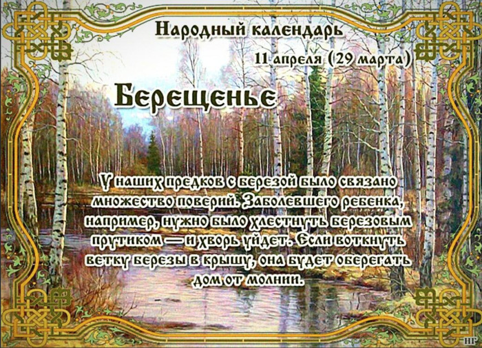 Дата в 2022 году: 11 апреля , понедельник Другие названия: День березы; Берещение Традиции: Сбор березового сока; парение в бане с березовым веником; обряды излечения от болезней Народный праздник Берещенье отмечается 11 апреля 2022 года (дата по старому стилю – 29 марта). В этот день восточные славяне почитают березу. Название «берещенье» праздник получил за традицию собирать березовый сок. История Береза почитается многими народами. Она символизирует женское начало, заботу, здоровье и жизнь. Задолго до прихода христианской религии на Русь это дерево уже научились уважать и обращаться с ним бережно и осторожно. У него просили помощи и поддержки. Березу считали капризным и своенравным деревом. Отсюда и сохранившееся двоякое отношение к ней. Если ей понравился человек, то она будет поддерживать его, подарит удачу и счастье. Но часто просить ее о помощи нельзя. Она может обидеться и сильно «запутать» жизнь человека. Отдельно выделяли плакучую березу. Ее считали деревом мертвых. В лечебных целях ее не использовали, только в магии. По поверью, она связана с загробным миром. К ней приходили, чтобы заручиться поддержкой умерших предков. Также считалось, что на ее ветвях любят сидеть русалки и утопленницы. В христианстве считается, что береза – дерево, которое способно выгнать из человека своеволие, своенравие и деспотизм. Ее использовали, чтобы изгнать дьявола. До прошлого века березовыми розгами наказывали крепостных, лгунов, непослушных детей и нерадивых учеников в школах. Традиции и обряды На Берещенье собирают березовый сок. По народному поверью, в этот день он обладает живительной силой. Беременные женщины ходят к березе просить помощи, чтобы легко разрешиться от бремени, а для будущего малыша – здоровья и счастья. Парятся в бане с березовым веником. Данная традиция называется «очищение крови». Если хорошо себя отхлестать ветками, это обновит, очистит и оздоровит кровь. Проводят обряды по излечению от недугов. Поят березовым соком больного человека. Он выгоняет из организма слабость и придает сил. Если болен ребенок, его нужно несильно хлестнуть березовым прутиком, и он обязательно поправится. Приметы и поверья Ранний гром – к холодам. Если с запада идут перистые облака, а горизонт чистый – жди ненастья. Если береза листья выбросила прежде ольхи, значит, лето будет засушливым. Если из березы идет обильно сок, то лето будет ненастным. Сорокины гнезда низко, значит, летом будет много гроз. Чтобы в дом не ударила молния, в крышу нужно воткнуть березовую ветку. | |