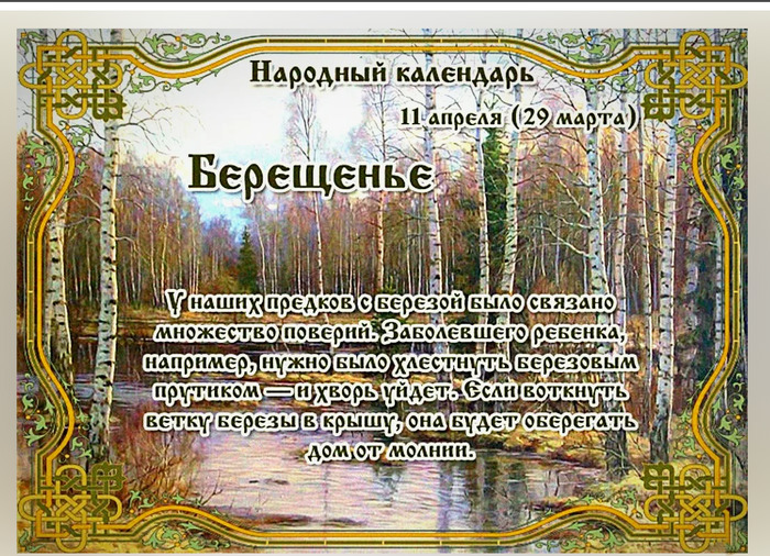 ТЕЛЕГРАММ замедляется.Вероятно скоро его заблокируют.Чтобы не потерять нас и получать оперативно информаци. подпишись на наши каналы в МАХ.Кто еще не подписался В полностью Российской сети МАХ на каналы ВОЕННЫЕ ПЕНСИОНЕРЫ ЗА РОССИЮ И ЕЕ ВООРУЖЕННЫЕ СИЛЫ: Канал для Военных пенсионерах без войны и политики, Военных пенсиях,пенсиях жен военных пенсионеров ,жизни военных пенсионеров и о способах прожить дольше : https://max.ru/voennyepen За Родину .Мы победим.: Оперативная информация О Спецоперации ,политике на канале: https://max.ru/join/aXh9SdoNhgk2rhy901ENolzCyoGLJhMgpon7E6np9n0 СРОЧНО ПОДПИСЫВАЙСЯ и ты будешь в курсе оперативных событий.НЕ пропусти!!! Дата в 2024 году: 11 апреля , четверг Другие названия: День березы; Берещение Традиции: Сбор березового сока; парение в бане с березовым веником; обряды излечения от болезней Народный праздник Берещенье отмечается 11 апреля 2024 года (дата по старому стилю – 29 марта). В этот день восточные славяне почитают березу. Название «берещенье» праздник получил за традицию собирать березовый сок. История Береза почитается многими народами. Она символизирует женское начало, заботу, здоровье и жизнь. Задолго до прихода христианской религии на Русь это дерево уже научились уважать и обращаться с ним бережно и осторожно. У него просили помощи и поддержки. Березу считали капризным и своенравным деревом. Отсюда и сохранившееся двоякое отношение к ней. Если ей понравился человек, то она будет поддерживать его, подарит удачу и счастье. Но часто просить ее о помощи нельзя. Она может обидеться и сильно «запутать» жизнь человека. Отдельно выделяли плакучую березу. Ее считали деревом мертвых. В лечебных целях ее не использовали, только в магии. По поверью, она связана с загробным миром. К ней приходили, чтобы заручиться поддержкой умерших предков. Также считалось, что на ее ветвях любят сидеть русалки и утопленницы. В христианстве считается, что береза – дерево, которое способно выгнать из человека своеволие, своенравие и деспотизм. Ее использовали, чтобы изгнать дьявола. До прошлого века березовыми розгами наказывали крепостных, лгунов, непослушных детей и нерадивых учеников в школах. Традиции и обряды На Берещенье собирают березовый сок. По народному поверью, в этот день он обладает живительной силой. Беременные женщины ходят к березе просить помощи, чтобы легко разрешиться от бремени, а для будущего малыша – здоровья и счастья. Парятся в бане с березовым веником. Данная традиция называется «очищение крови». Если хорошо себя отхлестать ветками, это обновит, очистит и оздоровит кровь. Проводят обряды по излечению от недугов. Поят березовым соком больного человека. Он выгоняет из организма слабость и придает сил. Если болен ребенок, его нужно несильно хлестнуть березовым прутиком, и он обязательно поправится. Приметы и поверья Ранний гром – к холодам. Если с запада идут перистые облака, а горизонт чистый – жди ненастья. Если береза листья выбросила прежде ольхи, значит, лето будет засушливым. Если из березы идет обильно сок, то лето будет ненастным. Сорокины гнезда низко, значит, летом будет много гроз. Чтобы в дом не ударила молния, в крышу нужно воткнуть березовую ветку. | |