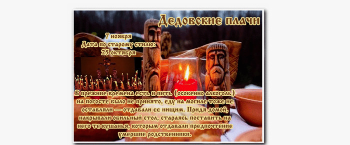 ТЕЛЕГРАММ замедляется.Вероятно скоро его заблокируют.Чтобы не потерять нас и получать оперативно информаци. подпишись на наши каналы в МАХ.Кто еще не подписался В полностью Российской сети МАХ на каналы ВОЕННЫЕ ПЕНСИОНЕРЫ ЗА РОССИЮ И ЕЕ ВООРУЖЕННЫЕ СИЛЫ: Канал для Военных пенсионерах без войны и политики, Военных пенсиях,пенсиях жен военных пенсионеров ,жизни военных пенсионеров и о способах прожить дольше : https://max.ru/voennyepen За Родину .Мы победим.: Оперативная информация О Спецоперации ,политике на канале: https://max.ru/join/aXh9SdoNhgk2rhy901ENolzCyoGLJhMgpon7E6np9n0 СРОЧНО ПОДПИСЫВАЙСЯ и ты будешь в курсе оперативных событий.НЕ пропусти!!! В Телеграмм создана группа " Военные пенсионеры за Россию и ее ВС. Мы победим". У кого есть Телеграмм просим вступить в нее. Там много интересного, срочного, очень оперативная информация, а также чего нельзя помещать в ОДНОКЛАССНИКАХ и на сайте. Вступить можно по ссылке: Военные пенсионеры за Россию и ее ВС. Мы победим "https://t.me/voenpenszaRossiu" Очень большая просьба НЕ ОТПИСЫВАТЬСЯ ОТ КАНАЛА, Необходимо нам 1000 подписчиков, чтобы нормально работать. Канал до этого времени будет работать в тестовом режиме. Мы стараемся понять, что Вам будет интересно читать и как работать дальше. Пишите, что бы Вам хотелось читать в ТЕЛЕГРАМ. Хоть в любой теме на сайте, хоть в Телеграмм. Чтобы не раздражали уведомления их можно ОТКЛЮЧИТЬ. Кого раздражают уведомления в Телеграм их можно отключить. Отключить уведомления можно нажав на надпись ОТКЛЮЧИТЬ УВЕДОМЛЕНИЯ внизу Дата в 2025 году: 7 ноября , пятница Традиции: Ритуальные плачи, воспоминание умерших родственников или друзей Народный праздник Дедовские плачи отмечается 7 ноября 2025 года (25 октября по старому стилю). В старину считалось, что в данный день рыдает сама природа, а значит, это должны делать и люди. Природа плачет снегом или дождем, а человек – горькими слезами. В этот день необходимо помянуть всех умерших родных, а ритуальный плач должен огласить всю округу. Традиции и обряды Традиционно в этот народный праздник приходили на кладбище, убирали могилки и зажигали свечи. Необходимо было помолиться не только за своих родных, но и за всех умерших. На кладбищах только читали молитвы, употреблять еду и питье было запрещено. Вся принесенная еда отдавалась нищим. По возвращении домой все садились за поминальный стол. В этот день должны были плакать все женщины и девушки. Плач начинали с причитаний о тяжелых воспоминаниях и о тех приметах, которые были увидены накануне. Вечерами зажигали свечи и просили помощи-совета у умерших. Сироты, собирающиеся в скором будущем выходить замуж, должны были попросить у умерших родителей благословения на брак. Плакать разрешалось везде, исключение составляла лишь подушка. Согласно поверью, если порыдать в нее, то слезы перейдут в пух и к тому человеку, который ляжет на нее отдохнуть. Если же он уснет на ней, то ему приснятся дурные и беспокойные сны. Приметы Подмечено, что в этот день зачастую идет дождь или снег. Если в этот праздник стоит сухая погода, то зима будет морозной и с метелями. Если листья во время осинового листопада упали вверх лицом, то зима будет морозной, а если наоборот, то теплой. Если человек занимается торговлей, то в этот день ему нельзя есть хлеб. А если торговая деятельность связана с зерновыми культурами, то на Дедовские плачи лучше оставаться на