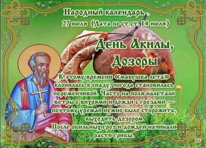 ТЕЛЕГРАММ замедляется.Вероятно скоро его заблокируют.Чтобы не потерять нас и получать оперативно информаци. подпишись на наши каналы в МАХ.Кто еще не подписался В полностью Российской сети МАХ на каналы ВОЕННЫЕ ПЕНСИОНЕРЫ ЗА РОССИЮ И ЕЕ ВООРУЖЕННЫЕ СИЛЫ: Канал для Военных пенсионерах без войны и политики, Военных пенсиях,пенсиях жен военных пенсионеров ,жизни военных пенсионеров и о способах прожить дольше : https://max.ru/voennyepen За Родину .Мы победим.: Оперативная информация О Спецоперации ,политике на канале: https://max.ru/join/aXh9SdoNhgk2rhy901ENolzCyoGLJhMgpon7E6np9n0 СРОЧНО ПОДПИСЫВАЙСЯ и ты будешь в курсе оперативных событий.НЕ пропусти!!! Дата в 2022 году: 27 июля , среда Другие названия: Акилов день; Акилы Соломенного; Акила Соломенный; Дозоры Церковное название: Апостола от 70-ти Акилы Значение: Почтение памяти апостола от 70-ти Акилы Гераклейского, епископа Традиции: Караул полей; обряд задабривания Полевого; сбор грибов Народный праздник День Акилы отмечается 27 июля 2022 года (по старому стилю – 14 июля). В церковном календаре это дата почтения памяти апостола от 70-ти Акилы Гераклейского, епископа. Название «Дозоры» праздник получил за то, что в этот период люди наблюдали за полями – ходили в дозор. История Акила жил в I веке. В 52 году его вместе с женой и другими иудеями изгнали из Рима по приказу императора Клавдия. Супруги поселились в Коринфе. Там они встретили апостола Павла и приютили его в своем доме. Апостол обратил их в христианство и лично крестил. Через полтора года Акила с женой последовали за учителем в Сирию проповедовать Слово Божие. После смерти Клавдия они вернулись в Рим. Но пробыли там недолго. Вскоре они покинули город, чтобы наставлять в святой вере язычников. Когда Акила пришел в Гераклею Понтийскую на берегу Черного моря, его избрали там епископом. Во времена гонений на христиан при императоре Нероне его с супругой казнили за исповедание чуждой язычникам религии. Традиции и обряды Люди сторожат поля. В этот период погода становится переменчивой. На поля часто налетают ветры с дождями и грозами. Они могут навредить урожаю, неубранному сену. Караульные внимательно смотрят, чтобы ветер не разметал сено, а огонь от молнии нанес как можно меньше ущерба. Дозорные также следят за тем, чтобы нечистая сила не обманула людей и не пробралась в дом. По народному поверью, в День Акилы она может проникнуть на землю. Нечисть устремляется в завихрение воздуха над полем и принимает образ домашней живности – птицы или животного. В таком облике она проникает в дома. Нечисть посильнее может обернуться ребенком, прикинуться сиротой, разжалобить человека и попросить приюта. В этот народный праздник люди задабривают Полевого (существо, которое живет на полях). В конце рабочего дня для него в последнем ряду срезанных злаков оставляют небольшой сноп колосьев, рядом ставят кашу в горшочке. Такой обряд проводят для того, чтобы Полевой помогал сберечь посев от ненастья и вырастить хороший урожай в следующем году. Дети собирают грибы в лесу. Приметы Если в этот день нет осадков, то осень будет недождливой. Восходящее солнце огненного цвета, и на небе много облаков – к дождю. Чайки качаются на воде – к погожему дню. | |