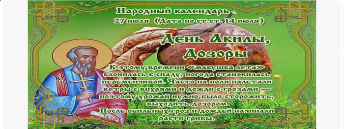 ТЕЛЕГРАММ замедляется.Вероятно скоро его заблокируют.Чтобы не потерять нас и получать оперативно информаци. подпишись на наши каналы в МАХ.Кто еще не подписался В полностью Российской сети МАХ на каналы ВОЕННЫЕ ПЕНСИОНЕРЫ ЗА РОССИЮ И ЕЕ ВООРУЖЕННЫЕ СИЛЫ: Канал для Военных пенсионерах без войны и политики, Военных пенсиях,пенсиях жен военных пенсионеров ,жизни военных пенсионеров и о способах прожить дольше : https://max.ru/voennyepen За Родину .Мы победим.: Оперативная информация О Спецоперации ,политике на канале: https://max.ru/join/aXh9SdoNhgk2rhy901ENolzCyoGLJhMgpon7E6np9n0 СРОЧНО ПОДПИСЫВАЙСЯ и ты будешь в курсе оперативных событий.НЕ пропусти!!! В Телеграмм создана группа " Военные пенсионеры за Россию и ее ВС. Мы победим". У кого есть Телеграмм просим вступить в нее. Там много интересного, срочного, очень оперативная информация, а также чего нельзя помещать в ОДНОКЛАССНИКАХ и на сайте. Вступить можно по ссылке: Военные пенсионеры за Россию и ее ВС. Мы победим "https://t.me/voenpenszaRossiu" Очень большая просьба НЕ ОТПИСЫВАТЬСЯ ОТ КАНАЛА, Канал работает в тестовом режиме. Мы стараемся понять, что Вам будет интересно читать и как работать дальше. Пишите, что бы Вам хотелось читать в ТЕЛЕГРАММ. Хоть в любой теме на сайте, хоть в Телеграмм. Чтобы не раздражали уведомления их можно ОТКЛЮЧИТЬ. Кого раздражают уведомления в Телеграмм их можно отключить. Отключить уведомления можно нажав на надпись ОТКЛЮЧИТЬ УВЕДОМЛЕНИЯ внизу Дата в 2025 году: 27 июля , воскресенье Другие названия: Акилов день; Акилы Соломенного; Акила Соломенный; Дозоры Церковное название: Апостола от 70-ти Акилы Значение: Почтение памяти апостола от 70-ти Акилы Гераклейского, епископа Традиции: Караул полей; обряд задабривания Полевого; сбор грибов Народный праздник День Акилы отмечается 27 июля 2025 года (по старому стилю – 14 июля). В церковном календаре это дата почтения памяти апостола от 70-ти Акилы Гераклейского, епископа. Название «Дозоры» праздник получил за то, что в этот период люди наблюдали за полями – ходили в дозор. История Акила жил в I веке. В 52 году его вместе с женой и другими иудеями изгнали из Рима по приказу императора Клавдия. Супруги поселились в Коринфе. Там они встретили апостола Павла и приютили его в своем доме. Апостол обратил их в христианство и лично крестил. Через полтора года Акила с женой последовали за учителем в Сирию проповедовать Слово Божие. После смерти Клавдия они вернулись в Рим. Но пробыли там недолго. Вскоре они покинули город, чтобы наставлять в святой вере язычников. Когда Акила пришел в Гераклею Понтийскую на берегу Черного моря, его избрали там епископом. Во времена гонений на христиан при императоре Нероне его с супругой казнили за исповедание чуждой язычникам религии. Традиции и обряды Люди сторожат поля. В этот период погода становится переменчивой. На поля часто налетают ветры с дождями и грозами. Они могут навредить урожаю, неубранному сену. Караульные внимательно смотрят, чтобы ветер не разметал сено, а огонь от молнии нанес как можно меньше ущерба. Дозорные также следят за тем, чтобы нечистая сила не обманула людей и не пробралась в дом. По народному поверью, в День Акилы она может проникнуть на землю. Нечисть устремляется в завихрение воздуха над полем и принимает образ домашней живности – птицы или животного. В таком облике она проникает в дома. Нечисть посильнее может оберн
