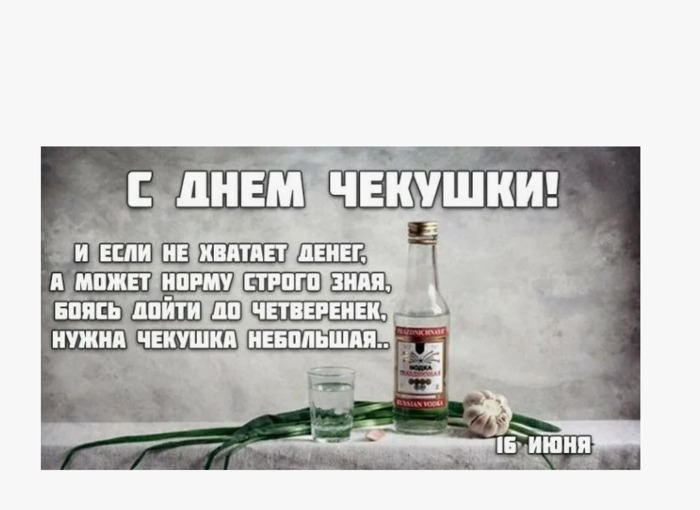 ТЕЛЕГРАММ замедляется.Вероятно скоро его заблокируют.Чтобы не потерять нас и получать оперативно информаци. подпишись на наши каналы в МАХ.Кто еще не подписался В полностью Российской сети МАХ на каналы ВОЕННЫЕ ПЕНСИОНЕРЫ ЗА РОССИЮ И ЕЕ ВООРУЖЕННЫЕ СИЛЫ: Канал для Военных пенсионерах без войны и политики, Военных пенсиях,пенсиях жен военных пенсионеров ,жизни военных пенсионеров и о способах прожить дольше : https://max.ru/voennyepen За Родину .Мы победим.: Оперативная информация О Спецоперации ,политике на канале: https://max.ru/join/aXh9SdoNhgk2rhy901ENolzCyoGLJhMgpon7E6np9n0 СРОЧНО ПОДПИСЫВАЙСЯ и ты будешь в курсе оперативных событий.НЕ пропусти!!! Дата в 2024 году: 16 июня , воскресенье День чекушки отмечается 16 июня 2024 года. Чекушка – стеклянная тара, которая вмещает в себя 250 мл (четверть литра) жидкости. Такая емкость у жителей разных стран ассоциируется в первую очередь с русской водкой. Само слово образовалось от старинной меры объема – четушки, которая равнялась двум чаркам. День чекушки – неофициальный праздник. История его происхождения неизвестна. В этот день можно устроить посиделки с друзьями, поговорить по душам, вспомнить интересные моменты из жизни. Интересные факты До Октябрьской революции 1917 года стеклотару объемом 250 мл называли «жуликом». Во времена Хрущева вышел запрет на торговлю водкой на разлив, а в магазинах исчезли бутылки-чекушки по 250 мл. Крылатое изречение «сообразить на троих» возникло в Советском Союзе, когда бутылка водки и закуска (плавленый сырок) стоили в сумме 3 рубля. Удобно было троим людям скидываться по одному рублю. В 1972-1978 гг. произошел ряд судебных разбирательств между СССР и европейскими производителями за право владения брендом «водка». В 1982 году Международный арбитражный суд признал приоритет производства водки в России. Чрезмерное употребление алкоголя вредит вашему здоровью | |