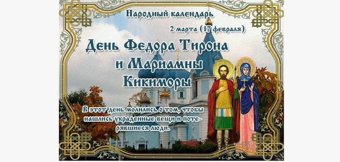 ТЕЛЕГРАММ замедляется.Вероятно скоро его заблокируют.Чтобы не потерять нас и получать оперативно информаци. подпишись на наши каналы в МАХ.Кто еще не подписался В полностью Российской сети МАХ на каналы ВОЕННЫЕ ПЕНСИОНЕРЫ ЗА РОССИЮ И ЕЕ ВООРУЖЕННЫЕ СИЛЫ: Канал для Военных пенсионерах без войны и политики, Военных пенсиях,пенсиях жен военных пенсионеров ,жизни военных пенсионеров и о способах прожить дольше : https://max.ru/voennyepen За Родину .Мы победим.: Оперативная информация О Спецоперации ,политике на канале: https://max.ru/join/aXh9SdoNhgk2rhy901ENolzCyoGLJhMgpon7E6np9n0 СРОЧНО ПОДПИСЫВАЙСЯ и ты будешь в курсе оперативных событий.НЕ пропусти!!! В Телеграмм создана группа " Военные пенсионеры за Россию и ее ВС. Мы победим". У кого есть Телеграмм просим вступить в нее. Там много интересного, срочного, очень оперативная информация, а также чего нельзя помещать в ОДНОКЛАССНИКАХ и на сайте. Вступить можно по ссылке: Военные пенсионеры за Россию и ее ВС. Мы победим "https://t.me/voenpenszaRossiu" Очень большая просьба НЕ ОТПИСЫВАТЬСЯ ОТ КАНАЛА, Канал работает в тестовом режиме. Мы стараемся понять, что Вам будет интересно читать и как работать дальше. Пишите, что бы Вам хотелось читать в ТЕЛЕГРАММ. Хоть в любой теме на сайте, хоть в Телеграмм. Чтобы не раздражали уведомления их можно ОТКЛЮЧИТЬ. Кого раздражают уведомления в Телеграмм их можно отключить. Отключить уведомления можно нажав на надпись ОТКЛЮЧИТЬ УВЕДОМЛЕНИЯ внизу Дата в 2025 году: 2 марта , воскресенье Другие названия: Федор; Федор-тиран; Маримьяна; День Мариамны; Мариамна Церковное название: Великомученика Феодора Тирона и праведной Мариамны Значение: Посвящен святым Феодору и Мариамне Традиции: Гадания на замужество; молитвы святым о помощи в нахождении украденной вещи или пропавшего человека, защите от шалостей кикиморы Народный праздник День Федора Тирона и Мариамны Кикиморы отмечается 2 марта 2025 года (по старому стилю – 17 февраля). В православном календаре это дата памяти святого мученика Феодора Тирона и праведной Мариамны. История Феодор Тирон из города Амасии Понтийской области служил в мармаритском полку под начальством Вринка. При правлении императора Максимиана (286-305 гг.) язычники преследовали христиан, но Феодор открыто исповедовал веру в Иисуса Христа. Вринк советовал ему отречься от своей религии и принести жертву идолам. За несколько дней, данных святому на размышления, сгорел языческий храм. Феодора обвинили в поджоге и бросили в темницу. В заточении великомученик все время посвящал молитвам. Там ему явился Христос, чтобы поддержать и утешить. Через время Феодора привели к местному правителю, который предложил ему отказаться от своих мировоззрений. Мученик безбоязненно подтвердил, что является приверженцем христианской веры. За это его приговорили к смертной казни через сожжение. Праведная Мариамна жила вместе с братом Филиппом, апостолом от 12-ти. Во время посещения ими Малой Азии к ним присоединился апостол Варфоломей. С тех пор Мариамна, дав обет безбрачия, посвятила себя проповедованию Евангелия наравне с апостолами, разделила с ними тяготы и скорби несения Слова Божия. Благодаря им в Иераполе Фигийском почти все горожане отказались от идолопоклонства. Правитель города выразил недовольство этим и приказал арестовать Мариамну и апостолов. Филиппа приговорили к смерти на кресте. Вскоре гнев Божий