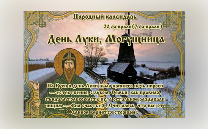 ТЕЛЕГРАММ замедляется.Вероятно скоро его заблокируют.Чтобы не потерять нас и получать оперативно информаци. подпишись на наши каналы в МАХ.Кто еще не подписался В полностью Российской сети МАХ на каналы ВОЕННЫЕ ПЕНСИОНЕРЫ ЗА РОССИЮ И ЕЕ ВООРУЖЕННЫЕ СИЛЫ: Канал для Военных пенсионерах без войны и политики, Военных пенсиях,пенсиях жен военных пенсионеров ,жизни военных пенсионеров и о способах прожить дольше : https://max.ru/voennyepen За Родину .Мы победим.: Оперативная информация О Спецоперации ,политике на канале: https://max.ru/join/aXh9SdoNhgk2rhy901ENolzCyoGLJhMgpon7E6np9n0 СРОЧНО ПОДПИСЫВАЙСЯ и ты будешь в курсе оперативных событий.НЕ пропусти!!! Дата в 2024 году: 20 февраля , вторник Другие названия: Лука; День святого Луки; Поминальный день; Феня – спасовы коренья Церковное название: Преподобного Луки Елладского Значение: Почтение памяти святого Луки Традиции: Поминание умерших; выпечка пирогов с луком; приготовление отваров, настоев; не играют свадьбы Народный праздник День Луки отмечается 20 февраля 2024 года (по старому стилю – 7 февраля). Православная церковь в этот день чтит память преподобного Луки Елладского. Второе название праздника – Могущница пошло от травы-лапчатки с крестообразными листиками. Считалось, что 20 февраля она приобретает необыкновенную силу и является более действенной. История Преподобный Лука (896–953 гг.) был родом из Кастории (Эрмиони). Он придерживался строгого аскетизма во всем, что касалось лично его, а также проявлял щедрую благожелательность по отношению к окружающим. Был известен как духовный наставник, хотя и не имел духовного сана. Лука родился в бедной семье и был вынужден много работать с детства. В юношеские годы много молился. После смерти отца ушел в монастырь в Афины, не сказав об этом матери. Там он принял постриг и стал иноком. Господь, по молитве тоскующей матери, вернул Луку в отчий дом. Через 4 месяца, уже с ее благословения, он отправился на Иоаннову гору, в церковь Космы и Дамиана, чтобы найти уединение. Там принял монашеский постриг, и Господь наделил его даром прозрения и исцеления душевных и физических болезней. Через 7 лет святой Лука покинул Иоаннову гору и отправился в Коринф. В течение 10 лет покорно и смиренно служил подвижнику в Патрах. Затем вновь вернулся на родину. Вместе со своим учеником он поселился в Каоавие, а спустя 3 года – на острове Ампиль. Покой Лука нашел лишь в Стирие (Стирида). Здесь, вместе со своей братией, он построил небольшой монастырь. В своей обители занимался благими делами – исцелял больных от душевных и телесных мук. Скончался в своей келье. Его мощи источали миро и исцеляли больных. На месте погребения преподобного Луки в 974 году началось воздвижение церкви (строение сохранилось до наших дней). Традиции и обряды В праздник принято поминать умерших родственников. В этот день пекут пироги с луковой начинкой. Несколько штук оставляют за порогом – для усопших родственников. Также в День Луки принято посещать могилы близких, ходить в церковь и молиться за них. Несколько луковых пирогов по традиции отдают нищим. Считается, что это на счастье. Знахари и травники посвящают этот день отварам, снадобьям и настоям. Приготовленные в праздник, они приобретают необыкновенную силу и считаются более действенными. Особенно это касается лапчатки. Ей приписывают исключительные целебные свойства. По поверью, в