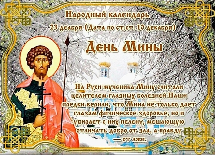 ТЕЛЕГРАММ замедляется.Вероятно скоро его заблокируют.Чтобы не потерять нас и получать оперативно информаци. подпишись на наши каналы в МАХ.Кто еще не подписался В полностью Российской сети МАХ на каналы ВОЕННЫЕ ПЕНСИОНЕРЫ ЗА РОССИЮ И ЕЕ ВООРУЖЕННЫЕ СИЛЫ: Канал для Военных пенсионерах без войны и политики, Военных пенсиях,пенсиях жен военных пенсионеров ,жизни военных пенсионеров и о способах прожить дольше : https://max.ru/voennyepen За Родину .Мы победим.: Оперативная информация О Спецоперации ,политике на канале: https://max.ru/join/aXh9SdoNhgk2rhy901ENolzCyoGLJhMgpon7E6np9n0 СРОЧНО ПОДПИСЫВАЙСЯ и ты будешь в курсе оперативных событий.НЕ пропусти!!! Дата в 2023 году: 23 декабря , суббота Другие названия: Мина, Мина – Светлые очи, Мина Глазница, Ермоген, Евграф Церковное название: Мучеников Мины, Ермогена и Евграфа Значение: День памяти святого Мины и с ним 2 мучеников Традиции: Молитвы об исцелении от глазных болезней; заговор от полуночницы Народный праздник День Мины отмечается 23 декабря 2023 года (по старому стилю – 10 декабря). В церковном календаре это дата почтения памяти Мины Красноречивого, Евграфа и Ермогена. История Мина был воеводой. Он находился в услужениях у императора Максимилиана в начале IV века. Был хорошо образованным и обладал даром красноречия, но, в отличие от своих собратьев, тайно исповедовал христианство. Когда в Александрии между христианами и язычниками началась смута, император послал туда Мину для разрешения дела. Тот успокоил граждан, но сам стал открыто проповедовать христианство. Узнав об этом, император послал епарха Ермогена, чтобы тот учинил суд над Миной и другими христианами. Во время суда Ермоген сам прозрел и принял от Мины крещение. Максимилиан не мог поверить в происходящее и решил сам совершить казнь над бывшим воеводой и епархом. Прибыв в Александрию, он подверг их мучительным пыткам и истязаниям, но так и не смог сломить их веру. Во время проведения пыток один из язычников Евграф уверовал в Господа Бога и стал во всеуслышание славить его имя. Разгневанный император умертвил Евграфа и приказал палачам обезглавить Мину и Ермогена. Традиции и обряды В этот день молятся мученику Мине об исцелении при глазных болезнях. Существует поверье, что святой может даровать особое зрение, которое поможет определить правду и ложь, добро и зло. Также в этот праздник принято произносить специальный заговор от полуночницы, который помогает спать детям и не просыпаться во время сна. Приметы Если в День Мины стоит ясная погода, то жди скорых морозов. Если в этот день звезды на ночном небе мерцать стали, то скоро начнется стужа. Если звезды начали ярко гореть, то вскоре ударят морозы. Если ночные звезды маленькими кажутся, то скоро снегопад пойдет. Если созвездие Большой Медведицы ясно увидеть можно, и если звезды в нем ярко горят, то жди бурана. Если снег легко ветром разносится, то лето будет без дождей. Если по небу белые облака плывут, то жди похолодания. Если пиво начало пениться в бочке, то скоро снег пойдет. Если птицы стали к дому подлетать и прятаться, то вскоре вьюга завоет. Если на небе облаков нет, то температура еще ниже упадет. Если в День Мины пошел дождь, то такая и весна будет. | |