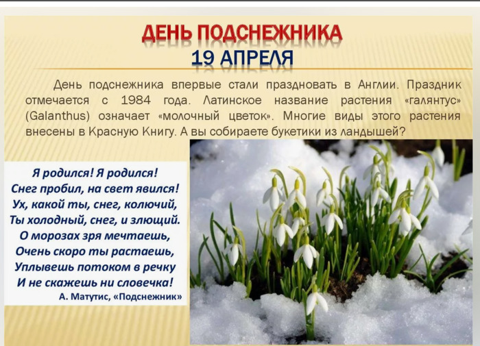 ТЕЛЕГРАММ замедляется.Вероятно скоро его заблокируют.Чтобы не потерять нас и получать оперативно информаци. подпишись на наши каналы в МАХ.Кто еще не подписался В полностью Российской сети МАХ на каналы ВОЕННЫЕ ПЕНСИОНЕРЫ ЗА РОССИЮ И ЕЕ ВООРУЖЕННЫЕ СИЛЫ: Канал для Военных пенсионерах без войны и политики, Военных пенсиях,пенсиях жен военных пенсионеров ,жизни военных пенсионеров и о способах прожить дольше : https://max.ru/voennyepen За Родину .Мы победим.: Оперативная информация О Спецоперации ,политике на канале: https://max.ru/join/aXh9SdoNhgk2rhy901ENolzCyoGLJhMgpon7E6np9n0 СРОЧНО ПОДПИСЫВАЙСЯ и ты будешь в курсе оперативных событий.НЕ пропусти!!! Дата в 2024 году: 19 апреля , пятница Подснежник – хрупкий белый цветок. Он символизирует окончание зимы и начало весны. Праздник, который посвятили ему, призван дарить весеннее тепло, вселять в людей надежду и вызывать улыбку. Международный день подснежника отмечается ежегодно 19 апреля. Впервые его отпраздновали англичане в 1984 году. Вслед за ними эту идею подхватили другие страны. Подснежник в Великобритании расцветает в середине апреля. В качестве даты празднования жители выбрали 19 число, чтобы цветок успел раскрыться и предстать во всей красе. В Великобритании подснежник любят и относятся к нему с трепетом, так же внимательно, как в Голландии к тюльпанам. По старинному английскому преданию тот, кто посадит вокруг дома снежные цветы, может не бояться злых духов. Есть и другие легенды, где подснежник – главный герой. В мире период цветения цветка, в зависимости от климатических условий, длится с января по апрель. В каждой стране его считают символом весны и тепла. Долгое время он обозначал непорочность. Раньше его легко находили в лесу и на полянах. Теперь некоторые виды находятся на грани исчезновения, и за торговлю дикими подснежниками выписывают штраф. Интересные факты Подснежник в Великобритании зовут «снежной каплей», в Германии – «снежным колокольчиком», а в Чехии – «снежинкой». По данным Королевских ботанических садов Кью, на планете 18 видов подснежника и два гибрида. На территории бывшего Советского Союза встречаются 12 из них. Только подснежник выживает в холодную пору ранней весны. Другие растения не способны повторить этот подвиг. | |