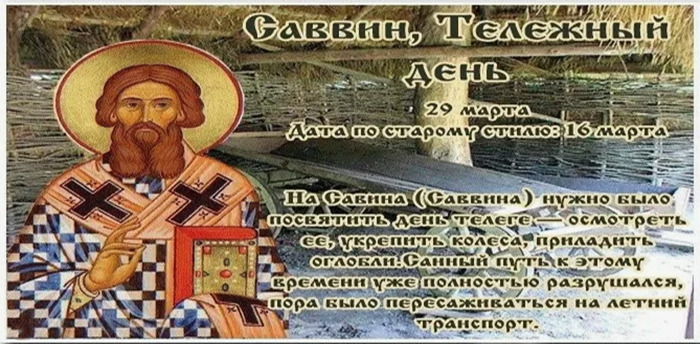 Дата в 2026 году: 29 марта , воскресенье Другие названия: Тележный день; Саввин день; Савин Церковное название: Мученика Савина Ермопольского (Египетского) Значение: Почтение памяти святого Савина Традиции: Осмотр и ремонт транспортных средств Народный праздник Саввин день отмечается 29 марта 2026 года (по старому стилю – 16 марта). В православном церковном календаре это дата почтения памяти мученика Савина Ермопольского (Египетского). В старину этот день полностью посвящали телегам – основному виду транспорта тех времен. Отсюда и название «Тележный день». История О святом мученике Савине известно очень мало. Он жил в III столетии нашей эры. Был главой города Гермополя (Ермополя) в Египте. Во времена гонений на христиан при императоре Диоклетиане, который славился жестокостью борьбы с христианским вероисповеданием, Савин спрятался в деревне. Его уговорили на это друзья по вере. Они не хотели потерять своего товарища и наставника. Но нищий, которому Савин до этого многократно помогал деньгами и провиантом, продал его за две золотых монеты. Он узнал о том, где скрывается святой и его друзья. Мужчин схватили и доставили на суд к правителю. После того, как они единогласно отказались изменить своей вере и принести жертву языческим идолам, их подвергли множеству жестоких пыток, а затем утопили в Ниле. Это случилось в 287 году. Традиции и обряды В старину мужчины в этот день осматривали телеги на предмет поломок, подновляли оглобли, колеса, обода. К этому времени снег таял, а дороги подсушивали ветры и солнце. Сани уже не подходили для езды. Необходимо было пересаживаться на телеги. После зимнего простоя они часто требовали небольшого ремонта. Традиция осмотра техники сохранилась и до наших дней. Мужчины и женщины посвящают Саввин день своему транспорту. Наступает пора его «переобуть», проверить масло, тормозную жидкость, отбалансировать колеса, осмотреть подвеску, пыльники и прочее. Многие станции техобслуживания 29 марта работают «до последнего клиента». Начинается сезон мотоциклов, скутеров и велосипедов. Их хозяева не меньше заботятся о своем транспорте. По традиции, в этот день они совершают первый весенний выезд. Приметы Если 29 марта тепло, то весна будет такой же. Облака высоко плывут – жди хорошей погоды. Одновременный прилет большого числа птиц говорит о том, что сезон будет теплым. Воробьи купаются и громко чирикают, значит, дни будут погожими. | |