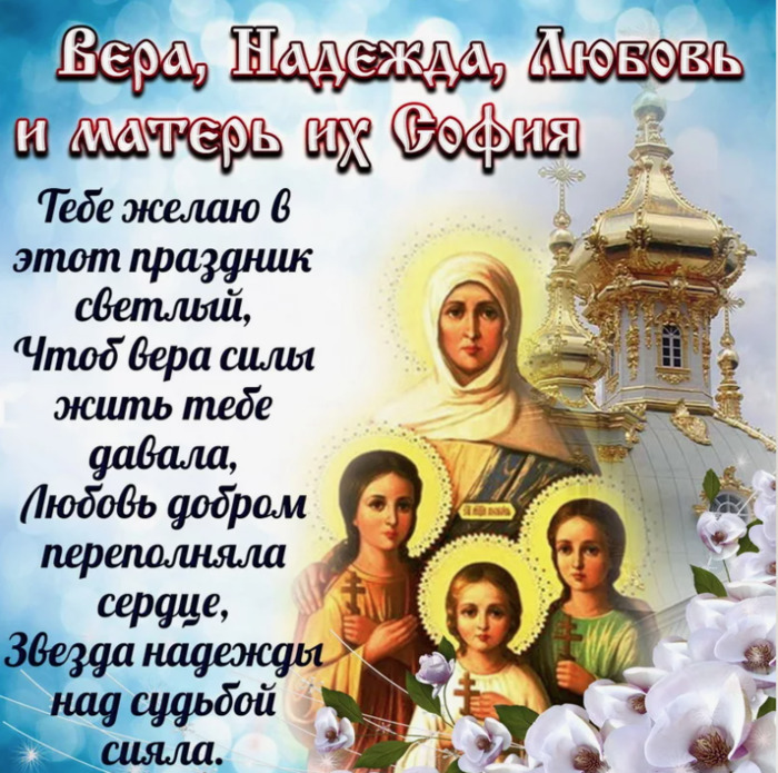 ТЕЛЕГРАММ замедляется.Вероятно скоро его заблокируют.Чтобы не потерять нас и получать оперативно информаци. подпишись на наши каналы в МАХ.Кто еще не подписался В полностью Российской сети МАХ на каналы ВОЕННЫЕ ПЕНСИОНЕРЫ ЗА РОССИЮ И ЕЕ ВООРУЖЕННЫЕ СИЛЫ: Канал для Военных пенсионерах без войны и политики, Военных пенсиях,пенсиях жен военных пенсионеров ,жизни военных пенсионеров и о способах прожить дольше : https://max.ru/voennyepen За Родину .Мы победим.: Оперативная информация О Спецоперации ,политике на канале: https://max.ru/join/aXh9SdoNhgk2rhy901ENolzCyoGLJhMgpon7E6np9n0 СРОЧНО ПОДПИСЫВАЙСЯ и ты будешь в курсе оперативных событий.НЕ пропусти!!! Дата в 2023 году: 30 сентября , суббота Другие названия: Вера, Надежда, Любовь; Вселенские бабьи именины; Всесветский бабий праздник; Девичий праздник; Бабья выть Церковное название: Мучениц Веры, Надежды, Любови и матери их Софии Значение: День памяти святой Софии и трех ее дочерей Традиции: Плач (избавление от горестей); «деревенские святцы» (поиск вторых половинок); заговор о покое в семье со свечами и караваем День Веры, Надежды и Любови отмечается 30 сентября 2023 года (дата по старому стилю – 17 сентября). В этот день православная церковь почитает святую Софию и ее трех дочерей. В народе праздник прозвали «бабьими именинами». День Веры, Надежды и Любови посвящен укреплению силы духа и мужества, которые не сможет сломить даже недостаток телесных сил. Традиции и обряды праздника В церквях проходит богослужение. На Руси в этот день женщины громко плакали, избавляя себя и семью от горестей, печали и бед. По окончании плача молодые юноши и девушки устраивали «деревенские святцы», где высматривали себе милых сердцу вторых половинок. Замужние женщины покупали три свечи. Две из них ставили в храме перед иконой Христа. Последнюю с наступлением полуночи вставляли в каравай и читали 40 раз без остановки слова о спокойствии и благополучии в семье. Утром этим караваем женщины кормили свою семью. История праздника В годы правления императора Адриана (II век, 137-й год) в Риме проживала вдова София с тремя дочерями: Верой (12 лет), Надеждой (10 лет) и Любовью (9 лет). Это было время христианских гонений, и слухи о верующей семье дошли до правителя. По повелению Адриана София с детьми предстала перед ним и вместе с дочерями рассказала ему о своей вере в Бога. Императора удивила смелость маленьких христианок. Он повелел одной из язычниц переубедить их, чтобы они отреклись от своей веры. Но все было напрасно. Тогда Адриан приказал им принести жертву его Богам, но его воля была отвергнута. Разгневанный император повелел разлучить мать с дочерями и подвергнуть сестер пыткам, а София должна была смотреть на это своими глазами. Веру и дух маленьких христианок не смогли сломить даже пытки. Мать похоронила истерзанные тела дочерей и два дня оставалась у их могилы, где и скончалась на третий день. За душевные муки за Христа церковь причислила их к лику святых. Проведи этот день интересно Задание на сегодня: Отпустите все горести и печали, поплачьте если нужно. А потом идите искать свою половинку. История праздника рассказывает об истории Софии и ее трех дочерей:Веры, Надежды и Любви. Семья была верующая и императору Рима Адриану это не понравилось. Он истязал дочерей на глазах матери в жертву богам. Эта грустная история послужила дню укрепления силы духа и мужест