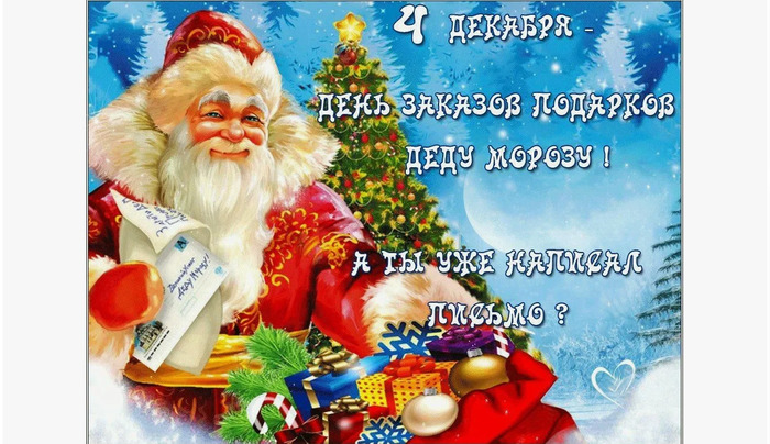 ТЕЛЕГРАММ замедляется.Вероятно скоро его заблокируют.Чтобы не потерять нас и получать оперативно информаци. подпишись на наши каналы в МАХ.Кто еще не подписался В полностью Российской сети МАХ на каналы ВОЕННЫЕ ПЕНСИОНЕРЫ ЗА РОССИЮ И ЕЕ ВООРУЖЕННЫЕ СИЛЫ: Канал для Военных пенсионерах без войны и политики, Военных пенсиях,пенсиях жен военных пенсионеров ,жизни военных пенсионеров и о способах прожить дольше : https://max.ru/voennyepen За Родину .Мы победим.: Оперативная информация О Спецоперации ,политике на канале: https://max.ru/join/aXh9SdoNhgk2rhy901ENolzCyoGLJhMgpon7E6np9n0 СРОЧНО ПОДПИСЫВАЙСЯ и ты будешь в курсе оперативных событий.НЕ пропусти!!! Спасибо всем неравнодушным .Деньги для сайта собрали .Для запасного сайта Военный пенсионер.рф необходимо еще 1700 руб дособрать. Но это не критично. Если кто хочет помочь,то мы будем очень благодарны. карта : 4006800071005382 Еще раз спасибо всем кто прислал и 1 руб и 3000 руб они помогли сайту выжить !!!! Дата в 2024 году: 4 декабря , среда 4 декабря отмечается один из любимых детских праздников – День заказа подарков Деду Морозу. Этого числа послушные и воспитанные дети составляют письма данному сказочному персонажу, в которых указывают, что хотят получить от него на Новый год. Многие малыши верят в существование Деда Мороза. Затем приходит взросление, в котором растворяется сказка. Есть теория, согласно которой дети способны не только видеть волшебных обитателей сказочного мира, но и общаться с ними. У Деда Мороза существует много помощников, и зовут их мама, папа и остальные ближайшие родственники. Эти люди ежегодно, как только приближается время волшебной новогодней ночи, стараются исполнить желания маленьких, но таких любимых членов своей семьи. Данный праздник – замечательная возможность для родителей в момент совместного написания письма заглянуть в приоткрывшуюся дверь внутреннего мира своего ребенка и понять, о каком подарке он мечтает больше всего. | |