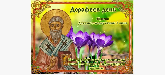 ТЕЛЕГРАММ замедляется.Вероятно скоро его заблокируют.Чтобы не потерять нас и получать оперативно информаци. подпишись на наши каналы в МАХ.Кто еще не подписался В полностью Российской сети МАХ на каналы ВОЕННЫЕ ПЕНСИОНЕРЫ ЗА РОССИЮ И ЕЕ ВООРУЖЕННЫЕ СИЛЫ: Канал для Военных пенсионерах без войны и политики, Военных пенсиях,пенсиях жен военных пенсионеров ,жизни военных пенсионеров и о способах прожить дольше : https://max.ru/voennyepen За Родину .Мы победим.: Оперативная информация О Спецоперации ,политике на канале: https://max.ru/join/aXh9SdoNhgk2rhy901ENolzCyoGLJhMgpon7E6np9n0 СРОЧНО ПОДПИСЫВАЙСЯ и ты будешь в курсе оперативных событий.НЕ пропусти!!! В Телеграмм создана группа " Военные пенсионеры за Россию и ее ВС. Мы победим". У кого есть Телеграмм просим вступить в нее. Там много интересного, срочного, очень оперативная информация, а также чего нельзя помещать в ОДНОКЛАССНИКАХ и на сайте. Вступить можно по ссылке: Военные пенсионеры за Россию и ее ВС. Мы победим "https://t.me/voenpenszaRossiu" Очень большая просьба НЕ ОТПИСЫВАТЬСЯ ОТ КАНАЛА, Канал работает в тестовом режиме. Мы стараемся понять, что Вам будет интересно читать и как работать дальше. Пишите, что бы Вам хотелось читать в ТЕЛЕГРАММ. Хоть в любой теме на сайте, хоть в Телеграмм. Чтобы не раздражали уведомления их можно ОТКЛЮЧИТЬ. Кого раздражают уведомления в Телеграмм их можно отключить. Отключить уведомления можно нажав на надпись ОТКЛЮЧИТЬ УВЕДОМЛЕНИЯ внизу Дата в 2025 году: 18 июня , среда Другие названия: День Дорофея; Дорофей; День Волхва-Дорофея; Волхв Дорофей; воробьиные ночи, день сон-травы; ночь сон-травы Церковное название: Священномученика Дорофея, епископа Тирского Значение: Почтение памяти священномученика Дорофея, епископа города Тира Финикийского Традиции: Наблюдение за ветром; сбор сон-травы Народный праздник Дорофеев день отмечается 18 июня 2025 года (дата по старому стилю – 5 июня). Православная церковь этого числа чтит память священномученика Дорофея Тирского, епископа. С Дорофеева дня ночи становятся наиболее короткими. За это в народе их прозвали воробьиными, такими же маленькими и быстрыми, как эта птичка. Они длятся 7–8 суток. Названия «день (ночь) сон-травы» праздник получил за то, что в этот день распускается это волшебное и загадочное растение. История Дорофей родился в 255 году в Антиохии. Где и как прошла его молодость, неизвестно. Упоминания о нем встречаются у Феофана Исповедника и в собрании исторических сведений Константинопольской Церкви. Там говорится о том, что он в зрелом возрасте был епископом в финикийском городе Тире. Когда при императоре Диоклетиане начались массовые преследования христиан, Дорофей покинул паству и скрылся в городе Одессе (современная Варна). После того как Константин Великий принял Миланский эдикт, епископ вернулся в Тир и полвека посвятил служению. С приходом к власти Флавия Юлиана, более известного как Отступник, гонения возобновились. Дорофей не смог спастись. Несмотря на старость епископа (ему тогда исполнилось 107 лет), его подвергли мучениям и убили. Традиции и обряды Согласно народному поверью, святой Дорофей управляет снами. Если приснилось что-то тревожное, нехорошее, нужно попросить у святого помощи. Он обязательно разгадает, успокоит и подскажет, что делать, чтобы отвести беду. В этот день люди внимательно наблюдают за направлением ветра. Северный и северо-з