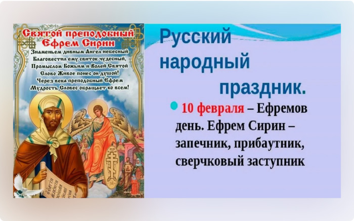 ТЕЛЕГРАММ замедляется.Вероятно скоро его заблокируют.Чтобы не потерять нас и получать оперативно информаци. подпишись на наши каналы в МАХ.Кто еще не подписался В полностью Российской сети МАХ на каналы ВОЕННЫЕ ПЕНСИОНЕРЫ ЗА РОССИЮ И ЕЕ ВООРУЖЕННЫЕ СИЛЫ: Канал для Военных пенсионерах без войны и политики, Военных пенсиях,пенсиях жен военных пенсионеров ,жизни военных пенсионеров и о способах прожить дольше : https://max.ru/voennyepen За Родину .Мы победим.: Оперативная информация О Спецоперации ,политике на канале: https://max.ru/join/aXh9SdoNhgk2rhy901ENolzCyoGLJhMgpon7E6np9n0 СРОЧНО ПОДПИСЫВАЙСЯ и ты будешь в курсе оперативных событий.НЕ пропусти!!! Дата в 2024 году: 10 февраля , суббота Другие названия: Ефрем – сверчковый заступник; Ефрем Сирин; Ефрем-ветродуй; кудесы; запечник; именины домового Церковное название: Преподобного Ефрема Сирина Значение: Почтение памяти святого Ефрема Традиции: Именины домового Народный праздник Ефремов день отмечается 10 февраля 2024 года (по старому стилю – 28 января). В православном календаре это дата почитания памяти преподобного Ефрема Сирина, иеродиакона. История Ефрем был родом из Месопотамии. Он жил в IV веке. Его родители были бедными земледельцами, но сына воспитывали в благочестии и смирении. По природе своей Ефрем имел вспыльчивый, раздражительный характер, но по велению Всевышнего смог ступить на путь смирения и стать учителем покаяния. Приняв монашество, он ушел жить в пустыню и стал отшельником. Поскольку Господь наградил его даром учительства, Ефрему не дано было находиться в одиночестве. Он смог сочетать самоотверженный труд и изучение Слова Божьего, черпая в нем силы для своей души и мудрость. Традиции и обряды Основным событием дня являются именины домового. Поэтому в данный праздник необходимо обязательно задобрить домашний дух. Для этого есть много способов. Кто-то предпочитает оставить блюдечко с молоком и печеньем. Кто-то режет черного петуха, смачивает его кровью веник и подметает им двор и дом. А кто-то угощает домового свежей кашей, оставленной в углу в глиняном горшочке. Согласно старому поверью, никто так хорошо не ладит с домовым, как кошка. Поэтому в Ефремов день ее не стоит обижать. Также ни в коем случае нельзя убивать насекомых, живущих в доме. Домовой этого не любит и может разозлиться. В этот праздник принято выметать полы в доме метлой, сделанной из полыни. Считается, что это помогает оградить жилище от плохих, завистливых людей и темной силы. Приметы Если на улице ветер гуляет, значит, летом будет много дождей. Воздух над лесом стал синим – к скорому теплу. | |