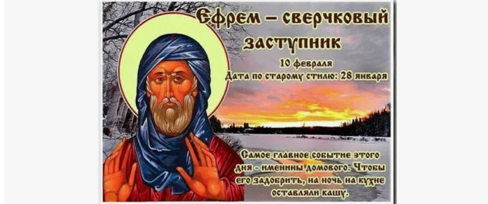 ТЕЛЕГРАММ замедляется.Вероятно скоро его заблокируют.Чтобы не потерять нас и получать оперативно информаци. подпишись на наши каналы в МАХ.Кто еще не подписался В полностью Российской сети МАХ на каналы ВОЕННЫЕ ПЕНСИОНЕРЫ ЗА РОССИЮ И ЕЕ ВООРУЖЕННЫЕ СИЛЫ: Канал для Военных пенсионерах без войны и политики, Военных пенсиях,пенсиях жен военных пенсионеров ,жизни военных пенсионеров и о способах прожить дольше : https://max.ru/voennyepen За Родину .Мы победим.: Оперативная информация О Спецоперации ,политике на канале: https://max.ru/join/aXh9SdoNhgk2rhy901ENolzCyoGLJhMgpon7E6np9n0 СРОЧНО ПОДПИСЫВАЙСЯ и ты будешь в курсе оперативных событий.НЕ пропусти!!! Дата в 2026 году: 10 февраля , вторник Другие названия: Ефрем – сверчковый заступник; Ефрем Сирин; Ефрем-ветродуй; кудесы; запечник; именины домового Церковное название: Преподобного Ефрема Сирина Значение: Почтение памяти святого Ефрема Традиции: Именины домового Народный праздник Ефремов день отмечается 10 февраля 2026 года (по старому стилю – 28 января). В православном календаре это дата почитания памяти преподобного Ефрема Сирина, иеродиакона. История Ефрем был родом из Месопотамии. Он жил в IV веке. Его родители были бедными земледельцами, но сына воспитывали в благочестии и смирении. По природе своей Ефрем имел вспыльчивый, раздражительный характер, но по велению Всевышнего смог ступить на путь смирения и стать учителем покаяния. Приняв монашество, он ушел жить в пустыню и стал отшельником. Поскольку Господь наградил его даром учительства, Ефрему не дано было находиться в одиночестве. Он смог сочетать самоотверженный труд и изучение Слова Божьего, черпая в нем силы для своей души и мудрость. Традиции и обряды Основным событием дня являются именины домового. Поэтому в данный праздник необходимо обязательно задобрить домашний дух. Для этого есть много способов. Кто-то предпочитает оставить блюдечко с молоком и печеньем. Кто-то режет черного петуха, смачивает его кровью веник и подметает им двор и дом. А кто-то угощает домового свежей кашей, оставленной в углу в глиняном горшочке. Согласно старому поверью, никто так хорошо не ладит с домовым, как кошка. Поэтому в Ефремов день ее не стоит обижать. Также ни в коем случае нельзя убивать насекомых, живущих в доме. Домовой этого не любит и может разозлиться. В этот праздник принято выметать полы в доме метлой, сделанной из полыни. Считается, что это помогает оградить жилище от плохих, завистливых людей и темной силы. Приметы Если на улице ветер гуляет, значит, летом будет много дождей. Воздух над лесом стал синим – к скорому теплу. | |