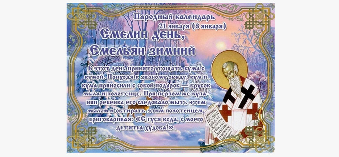 ТЕЛЕГРАММ замедляется.Вероятно скоро его заблокируют.Чтобы не потерять нас и получать оперативно информаци. подпишись на наши каналы в МАХ.Кто еще не подписался В полностью Российской сети МАХ на каналы ВОЕННЫЕ ПЕНСИОНЕРЫ ЗА РОССИЮ И ЕЕ ВООРУЖЕННЫЕ СИЛЫ: Канал для Военных пенсионерах без войны и политики, Военных пенсиях,пенсиях жен военных пенсионеров ,жизни военных пенсионеров и о способах прожить дольше : https://max.ru/voennyepen За Родину .Мы победим.: Оперативная информация О Спецоперации ,политике на канале: https://max.ru/join/aXh9SdoNhgk2rhy901ENolzCyoGLJhMgpon7E6np9n0 СРОЧНО ПОДПИСЫВАЙСЯ и ты будешь в курсе оперативных событий.НЕ пропусти!!! В Телеграмм создана группа " Военные пенсионеры за Россию и ее ВС. Мы победим" .У кого есть Телеграмм просим вступить в нее. Там много интересного ,срочного, Очень оперативная информация ,а также чего нельзя помещать в ОДНОСЛАССНИКАХ и На сайте. Вступить можно по ссылке : Военные пенсионеры за Россию и ее ВС.Мы победим : https://t.me/voenpenszaRossiu Дата в 2025 году: 21 января , вторник Другие названия: Емельян, Емельян Зимний, Емельян Кумишный, Омельян – божьим светом осиян, Емельян – накрути буран, Отдание Святок, Перезимники, Провод коляд, Розданный день, Василисы зимние Церковное название: Святителя Емилиана Значение: День памяти святого Емилиана Традиции: Угощение кумовьев Народный праздник Емельяны Перезимники отмечается 21 января 2025 года (дата по старому стилю – 8 января). Верующие православной церкви в этот день чтут память преподобного Емилиана Исповедника, епископа Кизического. В простонародье его прозвали Кумишным, по причине встреч и посиделок с кумовьями. История О жизни Емилиана Исповедника известно немногое. Согласно сказаниям, он жил в IX веке во времена правления Льва Армянина и служил епископом Кизическим. Император вел борьбу с почитанием икон, и Емилиан попал к нему в немилость. Лев Армянин предлагал ему перестать заниматься почитанием, на что епископ отвечал отказом. Он возразил правителю, что эти вопросы должна решать церковь, а не государь император. За свое непослушание Емилиан был заточен в тюрьму и лишен сана. Он не отрекся от учения святых отцов и умер в заточении. Традиции и обряды Традиционно в первой половине дня люди ходили в гости друг к другу, так как приступать к работе можно было лишь после обеда. Особо угощали кума с кумой. Считалось, что крестники будут иметь весь год хорошее здоровье, если кумовья с радостью угостились. В ответ они дарили мыло и полотенце, чтобы крестники были румяными и белыми. Согласно поверью, мытье этим мылом защищает ребенка от болезней и порчи. Если брак совершается не по любви, а из корыстных побуждений, то парню следует в Емельяны Перезимники много выпить спиртного. Считается, что тогда в их браке будет спокойствие, и общение с немилой супругой будет проходить без скандалов. Приметы Если в этот день подул южный ветер или начался снегопад, то лето будет с грозами. Если на Емельяна стоит безветренная погода, то лето будет теплым. По этому дню определяют погоду на август. Если ночью путь освещает яркая луна и звезды усыпали ночное небо, то скоро ударит мороз. Если собака свернулась калачиком во дворе и заснула – жди холода. Если окна в этот день стали запотевать – оттепель не за горами. Если на Емельяна Перезимника ударили холода, то потепления ждать еще долго придется. | |