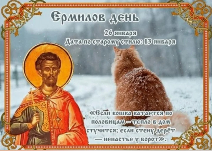 ТЕЛЕГРАММ замедляется.Вероятно скоро его заблокируют.Чтобы не потерять нас и получать оперативно информаци. подпишись на наши каналы в МАХ.Кто еще не подписался В полностью Российской сети МАХ на каналы ВОЕННЫЕ ПЕНСИОНЕРЫ ЗА РОССИЮ И ЕЕ ВООРУЖЕННЫЕ СИЛЫ: Канал для Военных пенсионерах без войны и политики, Военных пенсиях,пенсиях жен военных пенсионеров ,жизни военных пенсионеров и о способах прожить дольше : https://max.ru/voennyepen За Родину .Мы победим.: Оперативная информация О Спецоперации ,политике на канале: https://max.ru/join/aXh9SdoNhgk2rhy901ENolzCyoGLJhMgpon7E6np9n0 СРОЧНО ПОДПИСЫВАЙСЯ и ты будешь в курсе оперативных событий.НЕ пропусти!!! Дата в 2024 году: 26 января , пятница Другие названия: Ерема, Еремин день, Ерема на печи, Ермил – всем и вся мил Церковное название: Мучеников Ермила и Стратоника Значение: День памяти святых мучеников Ермила и Стратоника Белградских Традиции: Избавление от болезней и бессонницы при помощи кошки; запрещено работать Народный праздник Ермилов день отмечается 26 января 2024 года (по старому стилю – 13 января). В церковном православном календаре это дата почтения памяти мучеников Ермила и Стратоника Синигидонских (Белградских). История В конце III – начале IV веков при правлении царя Ликинии в городе Сингидон (в настоящее время Белград) служил диакон Ермил. Он проповедовал Слово Божие и был непреклонен в своей вере. Когда о его деятельности узнал царь, то приказал заточить Ермила в тюрьму. Подвергнутый пыткам, но не отказавшийся от веры, он был утоплен в Дунае. В тюрьме Ермилу сторожил Стратоник. Он был его другом и тайным христианином. Наблюдая за пытками и истязаниями над Ермилой, Стратоник проливал слезы. Эти слезы и стали причиной того, что он был уличен в христианской вере, подвергнут аналогичным пыткам и также утоплен в реке. Спустя 3 дня христиане обнаружили их тела на берегу реки и похоронили рядом с городом. Традиции и обряды Праздник традиционно отмечается дома по причине лютого мороза, который всегда ударяет в этот день. Согласно поверью, если человек проведет его в тепле, то не будет болеть, если же выйдет на мороз, то подхватит болезнь. Большое внимание в Ермилов день уделяется кошкам. Считается, что они могут вылечить болезнь. Если больной сядет там, где любит лежать это домашнее животное, то он поправится. Если ребенок плохо спит, то перед сном в его кроватку садят кошку. Согласно поверью, после этого малыш должен весь год сладко спать. В то место, которое кошка не любит, не желательно ставить кровать или стол. Это место считается «гнилым и гиблым». В Ермилов день запрещено работать. Время проводится за развлечениями и наблюдениями за приметами. Приметы Если в этот день кошка клубком сворачивается – ударят морозы. Если же она начала царапать стены или пол, то жди метели, а если решила потянуться – потепления. Если в этот день человек убьет кошку, то его ждет 7 несчастий. Если ночью вокруг луны круг светится, то вскоре закружит метель. Если на Ермила лес шумит, то скоро потеплеет. Если в этот день деревья в лесу затрещали, то вскоре ударят морозы. Если собака в клубок сворачивается, то холод не отступит. Если же она заснула возле будки, значит, приближается тепло. Если в Ермилов день синица начала щебетать под окном, то весна рано вступит в свои права. | |