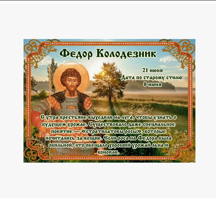 ТЕЛЕГРАММ замедляется.Вероятно скоро его заблокируют.Чтобы не потерять нас и получать оперативно информаци. подпишись на наши каналы в МАХ.Кто еще не подписался В полностью Российской сети МАХ на каналы ВОЕННЫЕ ПЕНСИОНЕРЫ ЗА РОССИЮ И ЕЕ ВООРУЖЕННЫЕ СИЛЫ: Канал для Военных пенсионерах без войны и политики, Военных пенсиях,пенсиях жен военных пенсионеров ,жизни военных пенсионеров и о способах прожить дольше : https://max.ru/voennyepen За Родину .Мы победим.: Оперативная информация О Спецоперации ,политике на канале: https://max.ru/join/aXh9SdoNhgk2rhy901ENolzCyoGLJhMgpon7E6np9n0 СРОЧНО ПОДПИСЫВАЙСЯ и ты будешь в курсе оперативных событий.НЕ пропусти!!! Дата в 2024 году: 21 июня , пятница Другие названия: Федоров день; Федор; Федор летний; Федор Стратилат; колодезник; Федор-навозник; навозник; навозница; толока Церковное название: Великомученика Феодора Стратилата Значение: День памяти великомученика Феодора Стратилата, Гераклийского Традиции: Поиск мест для строительства колодцев; удобрение земли навозом Народный праздник Федор Колодезник отмечается 21 июня 2024 года (по старому стилю – 8 июня). В церковном календаре это дата почтения памяти великомученика Феодора Стратилата, Гераклийского. Святой Феодор – заступник православного воинства. Название праздника «колодезник» связано с тем, что в этот день выбирается место для будущих колодцев. На Федора люди удобряют землю. Отсюда второе распространенное название дня – «навозник». История Феодор Стратилат жил в III–IV веках в Малой Азии. Он родился в городе Евхаите. Рос одаренным, чутким, внимательным и добросердечным юношей с красивой внешностью. За это Бог даровал ему совершенное овладение христианской истиной. Однажды до него дошел слух, что недалеко от города, где он жил, появился змей, который ежедневно пожирает людей и зверей. Юноша тайно взял коня и то немногое облачение, что у него было, и пошел на поиски чудовища, которое держало в страхе округу. Когда змей в очередной раз вышел на охоту, он вознес молитву, сразился с ним и победил. Подвиг принес Феодору известность, и его назначили стратилатом (военачальником) города Гераклеи. Там он продолжил проповеди, и вскоре почти весь город обратился в христианство. О том донесли правителю Лицинию. Он приказал привезти Феодора. Но тот ответил, что не может покинуть город, опасаясь бунта христиан. Феодор пригласил императора к себе, якобы для того, чтобы восстановить идолопоклонничество в населенном пункте. Лициний приехал в Гераклею, взяв лучшие изваяния богов. Феодор выпросил у него идолов, объяснив, что хочет лично заняться их установкой. Сам же распилил золотые и серебряные скульптуры и раздал куски нищим. Когда обман раскрылся, Лициний приказал казнить Феодора. Пять дней его мучили, после чего распяли. На следующий день стражи нашли мученика абсолютно здоровым, что стало еще одним чудом. Он помолился и добровольно пошел на казнь. Традиции и обряды В этот народный праздник колодезники ищут места для будущих колодцев. Накануне там, где предположительно есть вода, они оставляют на ночь сковородки, а утром смотрят, сколько на них влаги. В этот день принято удобрять поля навозом. Трудятся все: взрослые и дети. Самые старшие члены семьи готовят для них обед из 12 блюд. Приметы Грохочет в разных местах, значит, похолодает и возможен град. Много росы – к ясной погоде и хорошему урожаю ко