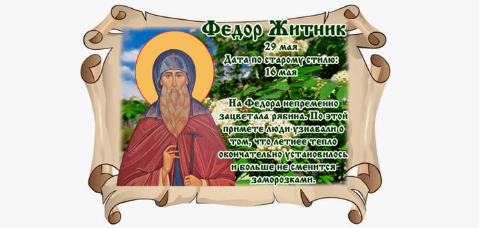 ТЕЛЕГРАММ замедляется.Вероятно скоро его заблокируют.Чтобы не потерять нас и получать оперативно информаци. подпишись на наши каналы в МАХ.Кто еще не подписался В полностью Российской сети МАХ на каналы ВОЕННЫЕ ПЕНСИОНЕРЫ ЗА РОССИЮ И ЕЕ ВООРУЖЕННЫЕ СИЛЫ: Канал для Военных пенсионерах без войны и политики, Военных пенсиях,пенсиях жен военных пенсионеров ,жизни военных пенсионеров и о способах прожить дольше : https://max.ru/voennyepen За Родину .Мы победим.: Оперативная информация О Спецоперации ,политике на канале: https://max.ru/join/aXh9SdoNhgk2rhy901ENolzCyoGLJhMgpon7E6np9n0 СРОЧНО ПОДПИСЫВАЙСЯ и ты будешь в курсе оперативных событий.НЕ пропусти!!! В Телеграмм создана группа " Военные пенсионеры за Россию и ее ВС. Мы победим". У кого есть Телеграмм просим вступить в нее. Там много интересного, срочного, очень оперативная информация, а также чего нельзя помещать в ОДНОКЛАССНИКАХ и на сайте. Вступить можно по ссылке: Военные пенсионеры за Россию и ее ВС. Мы победим "https://t.me/voenpenszaRossiu" Очень большая просьба НЕ ОТПИСЫВАТЬСЯ ОТ КАНАЛА, Канал работает в тестовом режиме. Мы стараемся понять, что Вам будет интересно читать и как работать дальше. Пишите, что бы Вам хотелось читать в ТЕЛЕГРАММ. Хоть в любой теме на сайте, хоть в Телеграмм. Чтобы не раздражали уведомления их можно ОТКЛЮЧИТЬ. Кого раздражают уведомления в Телеграмм их можно отключить. Отключить уведомления можно нажав на надпись ОТКЛЮЧИТЬ УВЕДОМЛЕНИЯ внизу Дата в 2025 году: 29 мая , четверг Другие названия: День Федора Житника; Федор; житник Церковное название: Преподобного Феодора Освященного, игумена Значение: День памяти святого Феодора Освященного, игумена Традиции: Посев хлебных злаков; приготовление каш из любой крупы Народный праздник Федор Житник отмечается 29 мая 2025 года (дата по старому стилю – 16 мая). По церковному календарю в этот день почитают преподобного Феодора Освященного, игумена. Название «Житник» день получил за то, что считался последним благоприятным сроком для посева хлебных злаков, которые обобщенно называют житом. История Преподобный Феодор родился в III веке в Египте в богатой семье. В 14 лет он выбрал путь инока-христианина и покинул отчий дом. Временно поселился в одной из обителей. Вскоре услышал о преподобном Пахомии и отправился к нему в надежде стать учеником святого старца. Пахомий с радостью принял юношу, потому что Господь предупредил о его приходе. Он не мог нарадоваться на иноческие подвиги своего ученика. Тот платил не меньшей любовью учителю, а также полным и беспрекословным послушанием. Вскоре после двадцатилетия Феодора преподобный назначил его главным при постройке Тавенисского монастыря. Его самого поразила неизлечимая болезнь, и он ушел в уединенное место. Феодор не оставил своего учителя и до самой смерти ухаживал за ним. Все это время к ним приходили монахи. Скоро их стало так много, что пришлось строить еще несколько общежитий. После смерти учителя Феодор стал игуменом фиваидских монастырей. За святость жизни Господь наградил его даром чудотворений. В 368 году, в возрасте приблизительно 53 лет, Феодор мирно отошел к Господу. Традиции и обряды В этот день сеют ячмень, пшеницу, рожь, овес. Преподобного Феодора Освященного в народе считают покровителем жита – хлебного зерна. Поэтому любую работу на земле начинают с молитвенного обращения к святому. Хозяйки готовят на обед каш