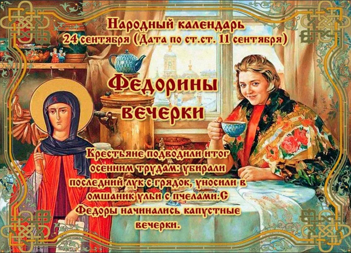 ТЕЛЕГРАММ замедляется.Вероятно скоро его заблокируют.Чтобы не потерять нас и получать оперативно информаци. подпишись на наши каналы в МАХ.Кто еще не подписался В полностью Российской сети МАХ на каналы ВОЕННЫЕ ПЕНСИОНЕРЫ ЗА РОССИЮ И ЕЕ ВООРУЖЕННЫЕ СИЛЫ: Канал для Военных пенсионерах без войны и политики, Военных пенсиях,пенсиях жен военных пенсионеров ,жизни военных пенсионеров и о способах прожить дольше : https://max.ru/voennyepen За Родину .Мы победим.: Оперативная информация О Спецоперации ,политике на канале: https://max.ru/join/aXh9SdoNhgk2rhy901ENolzCyoGLJhMgpon7E6np9n0 СРОЧНО ПОДПИСЫВАЙСЯ и ты будешь в курсе оперативных событий.НЕ пропусти!!! Дата в 2022 году: 24 сентября , суббота Другие названия: Федорин день; Федора – капустница; Федора осенняя; Федора – замочи хвосты; Федора – обдера Церковное название: Преподобной Феодоры Александрийской Младшей Значение: Почтение памяти святой Феодоры Традиции: Окончание уборки урожая овощей; рубка капусты для закваски; приготовление блюд из нее; варение пива; «осенщина» – дары священнику Народный праздник Федорины вечерки отмечается 24 сентября 2022 года (11 сентября – дата по старому стилю). Этим событием заканчивалась уборка урожая (овощей) и начиналась подготовка к зимней жизни. Праздник посвящен преподобной Феодоре Александрийской, жившей в V веке. В один из дней в нее влюбился местный богатый горожанин и захотел сделать своей любовницей, на что, будучи верной супругой, она отказалась. Подкупив сводню, Феодоре было внушено об отсутствии греха, если это будет совершено ночью. Позже, осознав обман и грех, она начала истязать свое тело. Знакомая настоятельница храма, сжалившись над ней, напомнила историю о М. Магдалине, и Феодора, не предупредив супруга, решила стать монахиней. Понимая, что муж сможет ее найти в женской обители, решила назваться Федором, облачиться в мужскую одежду и найти приют в мужском монастыре. После смерти жены супруг был впечатлен ее подвигом и стал монахом в том же монастыре. Традиции и обряды Праздник имеет несколько названий, которые равны в использовании: «Федора – замочи хвосты» – по причине обильных осадков и слякоти на дорогах, «Федора – обдера» – ввиду обдирания на ветру последних колосьев хлеба, «Федорины вечерки» – по причине ежевечерних 2-х недельных посиделок женщин, которые собирались с целью рубки капусты для закваски. Этот процесс проходил с весельем при хорошем настроении, а на столах ежедневно присутствовали блюда из капусты. На Федорины вечерки необходимо подойти к полю и поклониться до земли озимому урожаю (хлебу). Одной из традиций считается «осенщина». Каждый житель, кто чем богат, складывает дары для священника, а его жене (матушке) помогают в хозяйстве: заготовки, уборка, стирка и так далее. Пока женщины рубили капусту на вечерках, мужчины варили пиво и во время обеда обязательно поминали Феодору. Приметы Если озимые хорошо и дружно поднялись, значит, урожай будет богатым. В этот день лето заканчивается и осень начинается. Федора начинается – дела заканчиваются. Начать новое дело – плохая примета. | |
