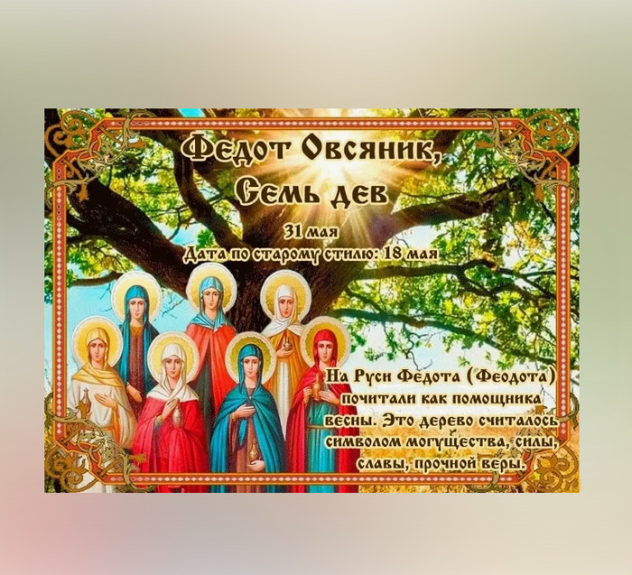 ТЕЛЕГРАММ замедляется.Вероятно скоро его заблокируют.Чтобы не потерять нас и получать оперативно информаци. подпишись на наши каналы в МАХ.Кто еще не подписался В полностью Российской сети МАХ на каналы ВОЕННЫЕ ПЕНСИОНЕРЫ ЗА РОССИЮ И ЕЕ ВООРУЖЕННЫЕ СИЛЫ: Канал для Военных пенсионерах без войны и политики, Военных пенсиях,пенсиях жен военных пенсионеров ,жизни военных пенсионеров и о способах прожить дольше : https://max.ru/voennyepen За Родину .Мы победим.: Оперативная информация О Спецоперации ,политике на канале: https://max.ru/join/aXh9SdoNhgk2rhy901ENolzCyoGLJhMgpon7E6np9n0 СРОЧНО ПОДПИСЫВАЙСЯ и ты будешь в курсе оперативных событий.НЕ пропусти!!! Дата в 2024 году: 31 мая , пятница Другие названия: Семь дев; День Федота-овсянника; овсяник; сев овса Церковное название: Мученика Феодота Анкирского и мучениц семи дев Значение: День памяти мученика Феодота Анкирского и семи дев-мучениц Традиции: Обряд вождения молодых вокруг дуба; лечение болей в спине Народный праздник Федот Овсяник отмечается 31 мая 2024 года (дата по старому стилю – 18 мая). В православном календаре этот день посвящается памяти мученика Феодота Анкирского и семи дев-мучениц. История Феодот и девы, которые избрали для себя Иисуса небесным женихом, жили в III веке в городе Анкире Галатийской. Феодот был владельцем небольшой корчмы и гостиницы. Во времена гонений ни христиан при императоре Диоклетиане правителем Анкиры поставили Феотекна, который приказал всех христиан подвергать мукам и казни. В то же время арестовали семь женщин преклонного возраста, одной из которых, Текусе, Феодот приходился племянником. На суде они открыто исповедали веру в Иисуса Христа. Феотекн глумился над их непорочностью и отдал женщин в блудный дом. Они стали взывать к Богу, а Текуса бросилась в ноги юношам и обнажила седые волосы. Молодые люди опомнились и убежали в слезах. А женщинам привязали на шеи камни и утопили в озере. В ту же ночь Феодоту во сне пришла Текуса и попросила похоронить их тела, как того требуют обычаи. Племянник и несколько христиан выполнили просьбу святой мученицы. Спустя несколько дней правителю донесли о том, что сделал Феодот. Два дня его подвергали всевозможным пыткам, но молитвы помогали мученику оставаться непоколебимым. На третий день ему отсекли голову и хотели сжечь тело. Бог не допустил этого, и христиане смогли предать тело мученика земле. Традиции и обряды На Федота Овсяника люди наблюдают за дубом и определяют, каким будет хлебород. Молодые приходят к дубу и трижды, держась за руки, обходят его кругом. Считается, что после такого обряда их союз будет таким же вечным и несокрушимым, как это дерево. В этот день люди лечат боли в спине при помощи специального заговора. Они произносят его над срезанной веточкой осины. В народе верят: тот, кто сделает все правильно, никогда не вспомнит о болях в спине и пояснице. Приметы Зарницы играют – к перемене погоды. Солнце на закате красное – к ветреным дням, в дымке или бледное – к дождям, в облака прячется – к непогоде на следующий день. У дуба верхушка с опушкой – будет хороший урожай овса. На дубе лист расправился, а на ясене еще нет – лето выдастся очень сухим. С дуба осыпаются здоровые листочки – будет голодный, неурожайный год. Волна против течения бьет – скоро начнется дождь. Дятлов далеко слышно – жди осадков. Если с вечера чибисы раскричались – погода буд