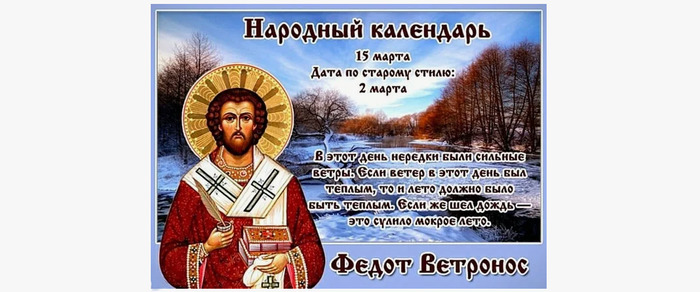 ТЕЛЕГРАММ замедляется.Вероятно скоро его заблокируют.Чтобы не потерять нас и получать оперативно информаци. подпишись на наши каналы в МАХ.Кто еще не подписался В полностью Российской сети МАХ на каналы ВОЕННЫЕ ПЕНСИОНЕРЫ ЗА РОССИЮ И ЕЕ ВООРУЖЕННЫЕ СИЛЫ: Канал для Военных пенсионерах без войны и политики, Военных пенсиях,пенсиях жен военных пенсионеров ,жизни военных пенсионеров и о способах прожить дольше : https://max.ru/voennyepen За Родину .Мы победим.: Оперативная информация О Спецоперации ,политике на канале: https://max.ru/join/aXh9SdoNhgk2rhy901ENolzCyoGLJhMgpon7E6np9n0 СРОЧНО ПОДПИСЫВАЙСЯ и ты будешь в курсе оперативных событий.НЕ пропусти!!! В Телеграмм создана группа " Военные пенсионеры за Россию и ее ВС. Мы победим". У кого есть Телеграмм просим вступить в нее. Там много интересного, срочного, очень оперативная информация, а также чего нельзя помещать в ОДНОКЛАССНИКАХ и на сайте. Вступить можно по ссылке: Военные пенсионеры за Россию и ее ВС. Мы победим "https://t.me/voenpenszaRossiu" Очень большая просьба НЕ ОТПИСЫВАТЬСЯ ОТ КАНАЛА, Канал работает в тестовом режиме. Мы стараемся понять, что Вам будет интересно читать и как работать дальше. Пишите, что бы Вам хотелось читать в ТЕЛЕГРАММ. Хоть в любой теме на сайте, хоть в Телеграмм. Чтобы не раздражали уведомления их можно ОТКЛЮЧИТЬ. Кого раздражают уведомления в Телеграмм их можно отключить. Отключить уведомления можно нажав на надпись ОТКЛЮЧИТЬ УВЕДОМЛЕНИЯ внизу Дата в 2025 году: 15 марта , суббота Другие названия: Ветры-вихровеи; Федот – снежный занос Церковное название: Священномученика Феодота, епископа Киринейского Значение: Почтение памяти святого Феодота Киринейского Традиции: Посев семян томатов, перца, капусты на рассаду; воздержание от ссор, развлечений Народный праздник Федот Ветронос отмечается 15 марта 2025 года (по старому стилю – 2 марта). В православном календаре это дата почтения памяти святого мученика Феодота Киринейского, епископа. Название «Ветронос» день получил за сильные ветры. История Родина святого Феодота – город Галатия в Малой Азии. Но он трудился в сане епископа на острове Кипр в Киринии. Когда Феодот только прибыл в город, силой своей проповеди ему удалось обратить в христианское вероисповедание многих язычников. За это духовенство Кипра наградило его высшим священническим саном. В начале IV столетия началось гонение на христиан под предводительством правителя-язычника Ликиния. Епископ Феодот с двойным усердием продолжил призывать идолопоклонников отказаться от своей веры и прийти к Истинному Богу. Правитель Кипра Савин приказал арестовать его. Но Феодот сам явился к наместнику и тут же был предан жестоким пыткам, после чего заключен в тюрьму. Через пять дней его подвергли прилюдным истязаниям. Многие свидетели поразились терпению мученика и поверили в Христа. В то же время царь Константин Великий одержал победу над узурпатором Максенцием и освободил заключенных христиан. Мученик Феодот вернулся к обязанностям епископа Киринии и через два года мирно умер. Традиции и обряды Огородники сеют на рассаду семена помидоров, сладкого перца и капусты (ранней, цветной, брюссельской). В этот день время легко подхватить простуду, потому из дома без особой нужды выходить не следует. Праздник часто приходится на время Великого Поста. Поэтому и традиции, которых придерживаются люди, больше относятся 
