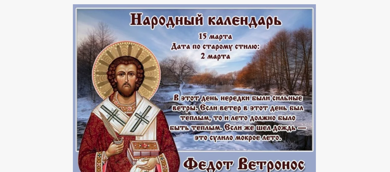 Дата в 2026 году: 15 марта , воскресенье Другие названия: Ветры-вихровеи; Федот – снежный занос Церковное название: Священномученика Феодота, епископа Киринейского Значение: Почтение памяти святого Феодота Киринейского Традиции: Посев семян томатов, перца, капусты на рассаду; воздержание от ссор, развлечений Народный праздник Федот Ветронос отмечается 15 марта 2026 года (по старому стилю – 2 марта). В православном календаре это дата почтения памяти святого мученика Феодота Киринейского, епископа. Название «Ветронос» день получил за сильные ветры. История Родина святого Феодота – город Галатия в Малой Азии. Но он трудился в сане епископа на острове Кипр в Киринии. Когда Феодот только прибыл в город, силой своей проповеди ему удалось обратить в христианское вероисповедание многих язычников. За это духовенство Кипра наградило его высшим священническим саном. В начале IV столетия началось гонение на христиан под предводительством правителя-язычника Ликиния. Епископ Феодот с двойным усердием продолжил призывать идолопоклонников отказаться от своей веры и прийти к Истинному Богу. Правитель Кипра Савин приказал арестовать его. Но Феодот сам явился к наместнику и тут же был предан жестоким пыткам, после чего заключен в тюрьму. Через пять дней его подвергли прилюдным истязаниям. Многие свидетели поразились терпению мученика и поверили в Христа. В то же время царь Константин Великий одержал победу над узурпатором Максенцием и освободил заключенных христиан. Мученик Феодот вернулся к обязанностям епископа Киринии и через два года мирно умер. Традиции и обряды Огородники сеют на рассаду семена помидоров, сладкого перца и капусты (ранней, цветной, брюссельской). В этот день время легко подхватить простуду, потому из дома без особой нужды выходить не следует. Праздник часто приходится на время Великого Поста. Поэтому и традиции, которых придерживаются люди, больше относятся к нему. Желательно воздерживаться от ссор, брани, употребления нецензурной лексики, дурных мыслей и развлечений. Приметы Северный ветер со снегом и мороз пророчат прохладное лето. Весь день идет снег, значит, тепло наступит нескоро. Какая погода на Федота Ветроноса – такая будет и 22 мая. Длинные сосульки означают долгую весну. Морозный день – будут проблемы с запасами корма для скота и сенокосом. Если случился снежный занос, то трава долго не вырастет. 15 марта принято считать днем, когда закипают подземные источники. Происходит большая последняя оттепель. Если в этот день посадить лук и сельдерей, то они дадут хороший урожай. | |