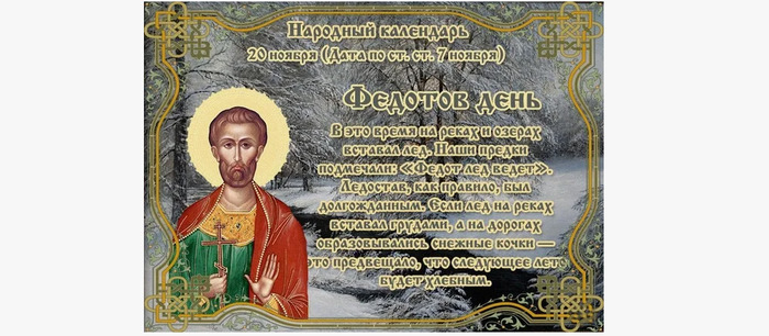 ТЕЛЕГРАММ замедляется.Вероятно скоро его заблокируют.Чтобы не потерять нас и получать оперативно информаци. подпишись на наши каналы в МАХ.Кто еще не подписался В полностью Российской сети МАХ на каналы ВОЕННЫЕ ПЕНСИОНЕРЫ ЗА РОССИЮ И ЕЕ ВООРУЖЕННЫЕ СИЛЫ: Канал для Военных пенсионерах без войны и политики, Военных пенсиях,пенсиях жен военных пенсионеров ,жизни военных пенсионеров и о способах прожить дольше : https://max.ru/voennyepen За Родину .Мы победим.: Оперативная информация О Спецоперации ,политике на канале: https://max.ru/join/aXh9SdoNhgk2rhy901ENolzCyoGLJhMgpon7E6np9n0 СРОЧНО ПОДПИСЫВАЙСЯ и ты будешь в курсе оперативных событий.НЕ пропусти!!! Удивляюсь я : пенсию получили ,на сайт ходит много народу и жалко 1 рубля, что бы сайт существовал? Дело идет к закрытию сайта,2-х групп на ОДНОКЛАССНИКАХ и запасного сайта. Основной массе военпенсов как всегда Все равно. Как боялись поддержать обращения к Власти да и всего военпенсы боятся. Бог Вам судья Сбор добровольных пожертвований идет очень медленно. Дело идет к закрытию сайта. Нам важна любая помощь .Для продолжения работы сайта необходимы деньги. Если не сможем собрать 16800 руб до 15 декабря придется закрыть сайт.Кто хочет помочь сайту добровольно, перечислите деньги в сумме от 1 рубля на карту 4006800071005382 Деньги перечислить можно через мобильное приложение Вашего банка , можно обратиться в банк или через банкомат .Информация о количестве собранных денег будет публиковаться регулярно .Как насобираем необходимую сумму сбор пожертвований для оплаты сайта будет прекращен . Дата в 2024 году: 20 ноября , среда Другие названия: Федот Ледостав, Федот Корчемник Церковное название: Мученика Феодота корчемника Значение: Почтение памяти святого Феодота Традиции: Занятие тканьем; запрещено вязать Народный праздник Федотов день отмечается 20 ноября 2024 года (по старому стилю – 7 ноября). В церковном календаре это дата почтения памяти святого мученика Феодота. В простонародье его прозвали Ледоставом, так как в этот день лед продолжал сковывать реки и озера. История Феодот проживал в III веке в городе Мелетии. Он открыто проповедовал христианскую веру. Был очень добрым и во всем помогал христианам: впускал их в свой дом для проведения Богослужения, посещал их в тюрьмах, выкупал, хоронил. Однажды он достал из моря тела 7 мучениц и предал их земле. Об этом сразу же донесли правителю, и стража схватила Феодота. Он был подвергнут жесточайшим пыткам, но не отрекся от своей веры, за что и был обезглавлен. Правитель повелел сжечь его тело, но поднявшаяся буря помешала это сделать, и христиане захоронили его согласно обычаям. Традиции и обряды В данный праздник женщины садятся за прялку и занимаются тканьем. В этот день запрещается вязать. Этого времени с нетерпением ждут все жители деревень, так как реки и озера продолжают сковываться льдом, и передвигаться можно теперь не только по дорогам (которые, к тому же, развозит непролазная грязь). Приметы Если на дворе гололед, то такая погода простоит еще несколько дней. Если обильно идет снег, то весной разойдутся реки. Если галки подняли беспокойный крик – быть снегопаду. Если на Федота выпал обильный первый снег и покрыл сырую землю, то рожь уродится. Если выпавший снег лег плотно к стенам дома, то урожай будет неказистым, а если есть зазоры, то богатым. Если беременная женщина в этот день будет читать мол