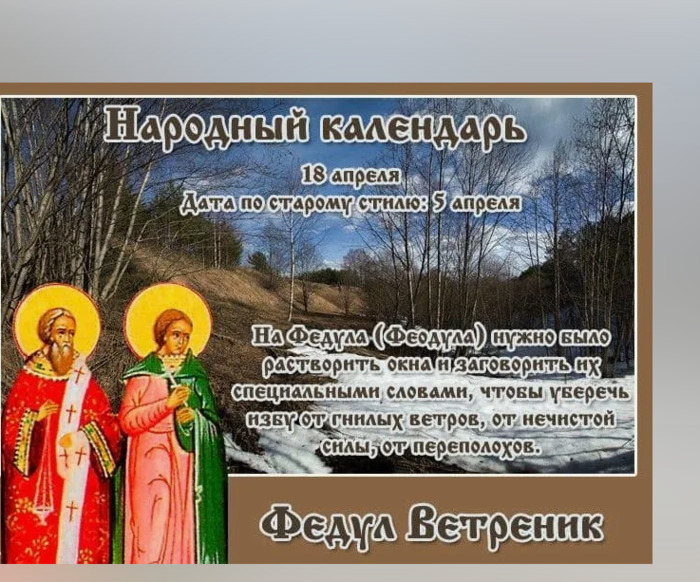 ТЕЛЕГРАММ замедляется.Вероятно скоро его заблокируют.Чтобы не потерять нас и получать оперативно информаци. подпишись на наши каналы в МАХ.Кто еще не подписался В полностью Российской сети МАХ на каналы ВОЕННЫЕ ПЕНСИОНЕРЫ ЗА РОССИЮ И ЕЕ ВООРУЖЕННЫЕ СИЛЫ: Канал для Военных пенсионерах без войны и политики, Военных пенсиях,пенсиях жен военных пенсионеров ,жизни военных пенсионеров и о способах прожить дольше : https://max.ru/voennyepen За Родину .Мы победим.: Оперативная информация О Спецоперации ,политике на канале: https://max.ru/join/aXh9SdoNhgk2rhy901ENolzCyoGLJhMgpon7E6np9n0 СРОЧНО ПОДПИСЫВАЙСЯ и ты будешь в курсе оперативных событий.НЕ пропусти!!! Дата в 2024 году: 18 апреля , четверг Другие названия: Федул; Федул Теплый; Федора-ветреница; Федора; Федулы-ветренники Церковное название: Мучеников Агафопода, диакона, Феодула, чтеца, и иже с ними Значение: Почтение памяти святого Феодула Солунского (Фессалоникийского) Традиции: Проветривание помещений; лечение от испуга Народный праздник Федул Ветреник отмечается 18 апреля 2024 года (по старому стилю – 5 апреля). В церковном календаре это дата почтения памяти мученика Феодула Солунского (Фессалоникийского), чтеца. Название «Ветреник» связано с ветром, который в этот день усиливается и дует постоянно. Содержание статьи История Феодул жил в III-IV столетии в Фессалониках во времена соправителей Диоклетиана и Максимина. Юный чтец вел благочестивую праведную жизнь. Однажды в полусне ему привиделось, что неизвестный в светлом одеянии что-то вкладывает в его ладонь. Феодул открыл глаза и обнаружил в руке красивый перстень с изображением Креста. Он понял, что это знамение его грядущих мучений. Благодаря силе кольца Феодул излечил от разных болезней и обратил в христианскую веру многих людей. Когда начались гонения на христиан, он остался при церкви. Вместе с диаконом Агафоподом продолжил открыто проповедовать Евангелие. По приказу местного правителя Фаустина молодого чтеца и старого диакона арестовали и привели к нему на суд. Фаустин сначала пытался лестью обратить в язычество Феодула, затем угрожал смертью. Но юнец был не по годам мудр. Он сказал, что выбирает вечную жизнь и не боится ради этого умереть. Феодула вместе с Агафоподом заточили в темницу. Там они открыли узникам Слово Божие. Многие отреклись от идолопоклонничества. Феодул и Агафопод продолжали неистово молиться. Однажды во сне они увидели, как их после крушения корабля выбросило на берег в светлых одеждах. Мученики проснулись и поняли, что Бог предвещает им скорую смерть. В то же утро их привели к правителю. Он объявил, что приговаривает обоих к смерти. К мученикам привязали камни и сбросили в море. Через время тела святых Феодула и Агафопода без веревок и в белых одеждах христиане нашли на берегу и похоронили. Случилось это в 303 году. Традиции и обряды На Федула Ветреника открывают окна и проветривают помещения прогретым весенним воздухом. Раньше этого дня впускать в дом ветер не рекомендуется, потому что он еще холодный – легко подхватить простуду. Межсезонные сквозняки очень опасны. По поверью, ветер на Федула уберегает дом от нечистой силы и болезни переполоха (испуга). Для этого нужно открыть все окна и произнести специальный заговор. Раньше верили, что «переполох» – это живое существо. Оно проникает в спящего человека и «награждает» болезнью порченого или бес