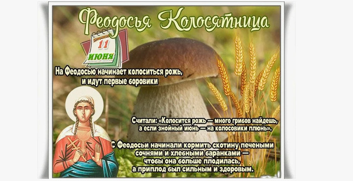ТЕЛЕГРАММ замедляется.Вероятно скоро его заблокируют.Чтобы не потерять нас и получать оперативно информаци. подпишись на наши каналы в МАХ.Кто еще не подписался В полностью Российской сети МАХ на каналы ВОЕННЫЕ ПЕНСИОНЕРЫ ЗА РОССИЮ И ЕЕ ВООРУЖЕННЫЕ СИЛЫ: Канал для Военных пенсионерах без войны и политики, Военных пенсиях,пенсиях жен военных пенсионеров ,жизни военных пенсионеров и о способах прожить дольше : https://max.ru/voennyepen За Родину .Мы победим.: Оперативная информация О Спецоперации ,политике на канале: https://max.ru/join/aXh9SdoNhgk2rhy901ENolzCyoGLJhMgpon7E6np9n0 СРОЧНО ПОДПИСЫВАЙСЯ и ты будешь в курсе оперативных событий.НЕ пропусти!!! В Телеграмм создана группа " Военные пенсионеры за Россию и ее ВС. Мы победим". У кого есть Телеграмм просим вступить в нее. Там много интересного, срочного, очень оперативная информация, а также чего нельзя помещать в ОДНОКЛАССНИКАХ и на сайте. Вступить можно по ссылке: Военные пенсионеры за Россию и ее ВС. Мы победим "https://t.me/voenpenszaRossiu" Очень большая просьба НЕ ОТПИСЫВАТЬСЯ ОТ КАНАЛА, Канал работает в тестовом режиме. Мы стараемся понять, что Вам будет интересно читать и как работать дальше. Пишите, что бы Вам хотелось читать в ТЕЛЕГРАММ. Хоть в любой теме на сайте, хоть в Телеграмм. Чтобы не раздражали уведомления их можно ОТКЛЮЧИТЬ. Кого раздражают уведомления в Телеграмм их можно отключить. Отключить уведомления можно нажав на надпись ОТКЛЮЧИТЬ УВЕДОМЛЕНИЯ внизу Дата в 2025 году: 11 июня , среда Другие названия: Федосья-колосяниц; Федосья; Феодосия; Феодосея; Федосья-колосятница; Федосия-колосница; колосяницы; колосава; во ржи колосья; Феодосии; Федосьи-колосницы; Федосья Гречишница; Феодосея-гречишница; гречушница Церковное название: Преподобномученицы Феодосии девы Значение: День памяти преподобномученицы Феодосии Константинопольской Традиции: Подкормка скота хлебом Народный праздник Феодосия Колосяница отмечается 11 июня 2025 года (дата по старому стилю – 29 мая). В этот день верующие православной церкви чтут память преподобномученицы Феодосии Константинопольской, девы. Название «Колосяница» праздник получил за то, что с этого дня начинает колоситься рожь. Если это произошло, значит, пришел срок для посева гречихи. Отсюда еще одно название дня – «Гречишница». Содержание статьи История Феодосия родилась в Константинополе в VIII веке. Она была единственным ребенком в семье. Долгие годы чета просила Бога послать им младенца. Однажды перед будущей матерью предстала святая Анастасия и сказала, что молитвы услышаны. Она вытерла слезы с лица женщины и предрекла ей скорую беременность. В 7 лет Феодосия осталась без отца. Мать отдала ее в женский монастырь святой мученицы Анастасии. Через 3 года не стало и матери. Достигнув совершеннолетия, Феодосия отдала все наследство монастырю, оставила лишь часть денег, золота и серебра. Из них золотых дел мастер сделал три иконы, а иконописец три образа – Христа, Богоматери и мученицы Анастасии. Когда правитель Лев Исавр приказал уничтожить все священные изображения, Феодосия одной из первых встала на их защиту. Со своими сестрами из монастыря она столкнула лестницу с солдатом, который хотел снять образ Спасителя, провисевший более 400 лет над «медными» воротами города. По приказу разгневанного Льва инокинь казнили. Феодосию подвергли жестокому истязанию – на протяжении семи дней она пол