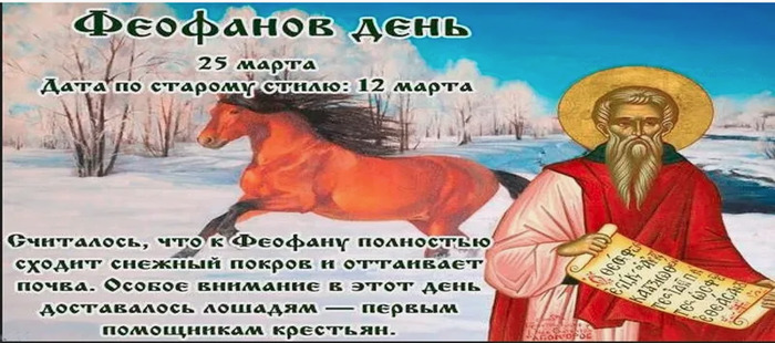 Дата в 2026 году: 25 марта , среда Другие названия: День Феофана; Феофан Церковное название: Преподобного Феофана Исповедника, Сигрианского Значение: Почтение памяти святого Феофана Сигрианского Традиции: Подготовка к посевным работам; заговоры от сглаза и болезней; уход за лошадьми Народный праздник Феофанов день отмечается 25 марта 2026 года (дата по старому стилю – 12 марта). Верующие православной церкви этого числа почитают святого Феофана Сигрианского. История Святой Феофан жил в VIII-IX веках. Его родина – город Константинополь. В три года он лишился отца. Дальнейшей жизнью мальчика озаботился друг покойного – император Лев Исаврянин. Перед свадьбой, к которой его обязывало новое положение, он договорился с будущей женой о сохранении целомудрия. Уже тогда молодого человека влекло желание стать монахом. После женитьбы Феофан встретил Григория Стратигия. Он принял от него монашеский постриг и благословение на возведение монастыря. Обитель построили на острове Калоним. Феофан посвящал себя молитвам и переписыванию книг. За это Господь даровал ему способность изгонять из человека болезни и бесов. Позже Феофан построил монастырь в Сигрианской области и стал в нем игуменом. В 50-летнем возрасте он сильно заболел и до самой смерти не мог полностью излечиться от недуга. Когда к власти пришел Лев Армянин, возобновилась борьба с иконами. Феофана арестовали, а монастырь сожгли. В тюрьме он не прожил и месяца. Традиции и обряды В этот день нет каких-то особых традиций. Те, кто занимается льном или коноплей, рассыпают горсти семян для птиц. Считается, что это поможет вырастить хороший лен и собрать богатый урожай. Остальные продолжают проводить подготовку к посевным работам. Знахари проводят обряды и читают заговоры от многих болезней и дурного глаза. В народе считается, что на Феофана полностью сходит снег и земля оттаивает. Поэтому принято выходить на улицу на рассвете и встречать весну. В этот день лошадей водят к воде и поят из серебра. Считается, что если животное заболеет на Феофана, то хворь не отступит до осени. Поэтому хозяева за несколько дней до праздника с опаской присматриваются к лошадям. Они боятся увидеть первые признаки болезни. Улучшается и уход за ними, ведь лошадь в хозяйстве стоит на втором месте по значимости после коровы. Приметы Теплая, весенняя погода стоит весь день – лето будет дождливым. Утренний туман – признак хорошего урожая льна и конопли. Кони громко расфыркались – к дождю. Если в этот день громко заржет лошадь – это к счастью. Если кони фыркают в пути, значит, впереди неприятная встреча. | |