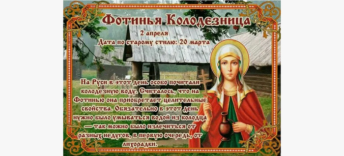 ТЕЛЕГРАММ замедляется.Вероятно скоро его заблокируют.Чтобы не потерять нас и получать оперативно информаци. подпишись на наши каналы в МАХ.Кто еще не подписался В полностью Российской сети МАХ на каналы ВОЕННЫЕ ПЕНСИОНЕРЫ ЗА РОССИЮ И ЕЕ ВООРУЖЕННЫЕ СИЛЫ: Канал для Военных пенсионерах без войны и политики, Военных пенсиях,пенсиях жен военных пенсионеров ,жизни военных пенсионеров и о способах прожить дольше : https://max.ru/voennyepen За Родину .Мы победим.: Оперативная информация О Спецоперации ,политике на канале: https://max.ru/join/aXh9SdoNhgk2rhy901ENolzCyoGLJhMgpon7E6np9n0 СРОЧНО ПОДПИСЫВАЙСЯ и ты будешь в курсе оперативных событий.НЕ пропусти!!! В Телеграмм создана группа " Военные пенсионеры за Россию и ее ВС. Мы победим". У кого есть Телеграмм просим вступить в нее. Там много интересного, срочного, очень оперативная информация, а также чего нельзя помещать в ОДНОКЛАССНИКАХ и на сайте. Вступить можно по ссылке: Военные пенсионеры за Россию и ее ВС. Мы победим "https://t.me/voenpenszaRossiu" Очень большая просьба НЕ ОТПИСЫВАТЬСЯ ОТ КАНАЛА, Канал работает в тестовом режиме. Мы стараемся понять, что Вам будет интересно читать и как работать дальше. Пишите, что бы Вам хотелось читать в ТЕЛЕГРАММ. Хоть в любой теме на сайте, хоть в Телеграмм. Чтобы не раздражали уведомления их можно ОТКЛЮЧИТЬ. Кого раздражают уведомления в Телеграмм их можно отключить. Отключить уведомления можно нажав на надпись ОТКЛЮЧИТЬ УВЕДОМЛЕНИЯ внизу Дата в 2025 году: 2 апреля , среда Другие названия: Колодезница; День Фотинии; Фотиния-самарянка; День славления льна Церковное название: Мученицы Фотины (Светланы) Самаряныни, Римской и ее сыновей Значение: Почтение памяти святой Фотины и ее двух сыновей Традиции: Молитвы святой Фотине об избавлении от болезней; умываение колодезной водой; вывешивание льняных вещей на улицу Народный праздник Фотинья Колодезница отмечается 2 апреля 2025 года (по старому стилю – 20 марта). В православном церковном календаре это дата памяти мученицы Фотины (Светланы) Самаряныни, Римской. В народе – день почитания колодезной воды. История Светлана (имя при крещении – Фотина) жила в I веке в Карфагене. Вместе с младшим сыном она открыто распространяла христианское учение. Именно о ней написано в Библии про встречу самарянки и Иисуса Христа у колодца возле города Сихарь. Император Нерон собирался казнить в Риме христиан, в том числе старшего сына Фотины Виктора. Святая с несколькими единомышленниками отправилась туда. Когда к императору доставили подсудимых, он предложил им отречься от своей веры или погибнуть в муках. Ни мужчины, ни женщины не приняли его предложения. Фотине на наковальне пытались раздробить кисти рук, но чудесным образом ее ладони остались невредимыми. Император отправил мученицу под надзор своей дочери. Но Фотина обратила в православие ее, служанок и подосланного отравителя. Разъяренный император приказал снять с женщины кожу и бросить ее в глубокий колодец. Затем Фотину извлекли и на 20 дней заперли в темнице. После этого ее снова привели к Нерону. Он еще раз предложил ей изменить свое решение и поднести жертвы идолам. Мученица рассмеялась ему в лицо и сказала, что он так же слеп, как его истуканы. Оскорбленный император приказал бросить ее обратно в колодец. Там Фотина и умерла. Традиции и обряды Святую Фотину почитают как целительницу. Ей молятся в этот праздник об из