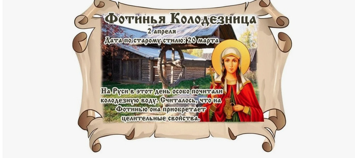 Дата в 2026 году: 2 апреля , четверг Другие названия: Колодезница; День Фотинии; Фотиния-самарянка; День славления льна Церковное название: Мученицы Фотины (Светланы) Самаряныни, Римской и ее сыновей Значение: Почтение памяти святой Фотины и ее двух сыновей Традиции: Молитвы святой Фотине об избавлении от болезней; умываение колодезной водой; вывешивание льняных вещей на улицу Народный праздник Фотинья Колодезница отмечается 2 апреля 2026 года (по старому стилю – 20 марта). В православном церковном календаре это дата памяти мученицы Фотины (Светланы) Самаряныни, Римской. В народе – день почитания колодезной воды. История Светлана (имя при крещении – Фотина) жила в I веке в Карфагене. Вместе с младшим сыном она открыто распространяла христианское учение. Именно о ней написано в Библии про встречу самарянки и Иисуса Христа у колодца возле города Сихарь. Император Нерон собирался казнить в Риме христиан, в том числе старшего сына Фотины Виктора. Святая с несколькими единомышленниками отправилась туда. Когда к императору доставили подсудимых, он предложил им отречься от своей веры или погибнуть в муках. Ни мужчины, ни женщины не приняли его предложения. Фотине на наковальне пытались раздробить кисти рук, но чудесным образом ее ладони остались невредимыми. Император отправил мученицу под надзор своей дочери. Но Фотина обратила в православие ее, служанок и подосланного отравителя. Разъяренный император приказал снять с женщины кожу и бросить ее в глубокий колодец. Затем Фотину извлекли и на 20 дней заперли в темнице. После этого ее снова привели к Нерону. Он еще раз предложил ей изменить свое решение и поднести жертвы идолам. Мученица рассмеялась ему в лицо и сказала, что он так же слеп, как его истуканы. Оскорбленный император приказал бросить ее обратно в колодец. Там Фотина и умерла. Традиции и обряды Святую Фотину почитают как целительницу. Ей молятся в этот праздник об избавлении от болезней, особенно лихорадки. Распространен способ лечения заболеваний при помощи молитвы (тропаря), которая написана на бумаге. Ее заворачивают в небольшой кусок материи и вешают больному на шею. Спустя три или девять дней (зависит от тяжести заболевания) тропарь сжигается на огне четверговой свечи, а пепел съедается. Согласно народному поверью, душа святой Фотины осталась в колодце, поэтому колодезная вода в этот день считается чудотворной. Ею умываются, обрызгивают помещения, животных и земельные наделы. 2 апреля – день, когда славят лен. Для этого красивые льняные вещи вывешивают на улицу. На Руси принято вешать на березы расписные свадебные полотенца. Девушки, для привлечения богатых женихов, водят хороводы с рушниками длиной от 2 до 6 метров. Приметы Если пошел дождь, значит, грибов будет много. Днем жарко, а ночью похолодало – ближайшие дни будут погожими. Если талой воды в избытке, то и травы будет много. Скворец прилетел – весну привел. | |