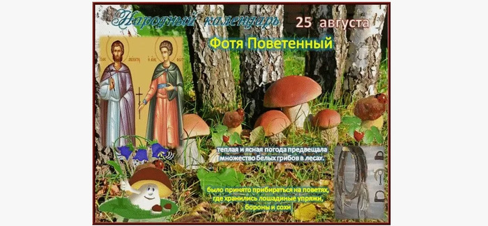 ТЕЛЕГРАММ замедляется.Вероятно скоро его заблокируют.Чтобы не потерять нас и получать оперативно информаци. подпишись на наши каналы в МАХ.Кто еще не подписался В полностью Российской сети МАХ на каналы ВОЕННЫЕ ПЕНСИОНЕРЫ ЗА РОССИЮ И ЕЕ ВООРУЖЕННЫЕ СИЛЫ: Канал для Военных пенсионерах без войны и политики, Военных пенсиях,пенсиях жен военных пенсионеров ,жизни военных пенсионеров и о способах прожить дольше : https://max.ru/voennyepen За Родину .Мы победим.: Оперативная информация О Спецоперации ,политике на канале: https://max.ru/join/aXh9SdoNhgk2rhy901ENolzCyoGLJhMgpon7E6np9n0 СРОЧНО ПОДПИСЫВАЙСЯ и ты будешь в курсе оперативных событий.НЕ пропусти!!! В Телеграмм создана группа " Военные пенсионеры за Россию и ее ВС. Мы победим". У кого есть Телеграмм просим вступить в нее. Там много интересного, срочного, очень оперативная информация, а также чего нельзя помещать в ОДНОКЛАССНИКАХ и на сайте. Вступить можно по ссылке: Военные пенсионеры за Россию и ее ВС. Мы победим "https://t.me/voenpenszaRossiu" Очень большая просьба НЕ ОТПИСЫВАТЬСЯ ОТ КАНАЛА, Канал работает в тестовом режиме. Мы стараемся понять, что Вам будет интересно читать и как работать дальше. Пишите, что бы Вам хотелось читать в ТЕЛЕГРАММ. Хоть в любой теме на сайте, хоть в Телеграмм. Чтобы не раздражали уведомления их можно ОТКЛЮЧИТЬ. Кого раздражают уведомления в Телеграмм их можно отключить. Отключить уведомления можно нажав на надпись ОТКЛЮЧИТЬ УВЕДОМЛЕНИЯ внизу Дата в 2025 году: 25 августа , понедельник Другие названия: День Святого огня; Никита Церковное название: Мучеников Фотия, Аникиты и многих с ними Значение: Приурочен к святым Аниките и его племяннику Фотию Традиции: Уборка нежилых помещений; обряд изгнания нечистой силы вересковым веником; озимые посевы; сбор черемухи Народный праздник Фотя Поветенный отмечается 25 августа 2025 года (по старому календарю – 12 августа). В этот день православной церковью чтится память мучеников Аникиты и его племянника. Аникита, дядя Фотия, будучи военным мужем, во всеуслышание обличил императора Диоклетиана в запугивании христиан, коим и сам был, приказом об установлении орудий казни на городской стене. Правитель приказал предать его мукам. Но каждый раз Господь отводил от него смерть: лев, приласкавшийся к нему; палач, уже занесший руку над Аникитой и тут же умерший; кипящее олово, в секунду остывшее. Видя все это, Фотий попытался объяснить императору, что это дела Всевышнего, а боги Диоклетиана – вымысел и ничто. За это он был приговорен вместе с дядей к еще более изощренным казням, в которых оба остались невредимыми. Разъяренный император велел сжечь их в большой печи. Во время казни многие люди ступили в печь вслед за мучениками. Традиции и обряды В народе этот день связан с уборкой нежилых помещений в деревнях и селах. Это и крытые навесом части двора, и отдельно стоящие строения, чердаки. В народе такие места именуют поветями (поветка, поветье). Отсюда и название праздника. 25 августа проводится обряд изгнания в этих местах нечистой силы с помощью верескового веника, которым метут по полу. Во многих областях в этот день сеют озимые. После чего тоже занимаются уборкой. В некоторых белорусских районах считается, что следующая неделя неблагоприятна для посева хлеба, потому что из помола получится «червивая» мука с мошками, которых невозможно будет вывести. На Фотю Поветенного собирают с