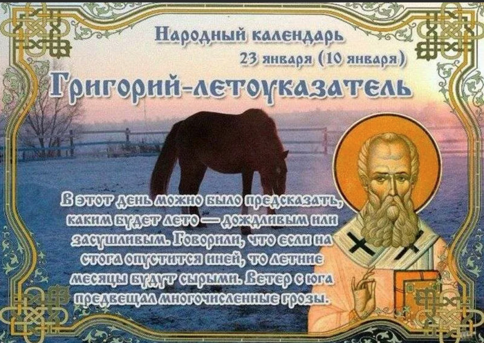 ТЕЛЕГРАММ замедляется.Вероятно скоро его заблокируют.Чтобы не потерять нас и получать оперативно информаци. подпишись на наши каналы в МАХ.Кто еще не подписался В полностью Российской сети МАХ на каналы ВОЕННЫЕ ПЕНСИОНЕРЫ ЗА РОССИЮ И ЕЕ ВООРУЖЕННЫЕ СИЛЫ: Канал для Военных пенсионерах без войны и политики, Военных пенсиях,пенсиях жен военных пенсионеров ,жизни военных пенсионеров и о способах прожить дольше : https://max.ru/voennyepen За Родину .Мы победим.: Оперативная информация О Спецоперации ,политике на канале: https://max.ru/join/aXh9SdoNhgk2rhy901ENolzCyoGLJhMgpon7E6np9n0 СРОЧНО ПОДПИСЫВАЙСЯ и ты будешь в курсе оперативных событий.НЕ пропусти!!! Дата в 2022 году: 23 января , воскресенье Другие названия: Григорий; Григорий Нисский; Летоуказатель; День Григория Церковное название: Святителя Григория Нисского, епископа Значение: День памяти святого Григория Традиции: подготовка к весенним посевным работам; употребление мясных блюд; обряд задабривания духа стогов, охраняющего зерно от мышей; обряд для привлечения богатства; запрещается выносить мусор Народный праздник Григорий Летоуказатель отмечается 23 января 2022 года (по старому стилю – 10 января). В церковном православном календаре это дата почтения памяти святителя Григория, епископа Нисского. В простонародье его прозвали Летоуказателем, так как по погоде этого дня судили в целом о лете. История Григорий проживал в IV веке в Кесарии (Каппадокия), где и получил образование. Его учителем был брат – святитель Василий Великий. Также он много времени потратил на самостоятельное обучение. Благодаря этому стал ритором (оратором) и ушел из церкви. После смерти супруги он вернулся в родное имение и церковь. В 372 г. Григория назначили на должность епископа Ниссы. С этого года его деятельность была посвящена борьбе с арианами. Григорий был схвачен, но ему удалось сбежать. Несколько лет он скитался, претерпевая невзгоды и страдания, но не оставил веру. В 381 г. в Константинополе был созван II Вселенский собор, где Григорий стал одним из главных деятелей. В 383, 386 и 394 годах он выступал в Константинополе, произнося разные Слова. Григорий рьяно защищал Православные догматы и стал авторитетным богословом империи. Он дожил до глубокой старости и умер после очередного Константинопольского собора. Традиции и обряды С этого дня начинается подготовка к весенним посевным работам. Проверяется и чинится инвентарь, перебирается зерно, часть которого идет на посадку, а часть – на переработку в муку. Из глубокой старины пришел обряд, который помогает задобрить духа стогов. Считается, что именно он охраняет зерно от грызунов. Для этого необходимо выйти в поле, отдать поклон скирдам и оставить каравай. В этот праздник запрещается выносить мусор и золу. В противном случае дом может покинуть счастье. Традиционно на Григория Летоуказателя проводится обряд для притяжения богатства. Считается, что если 3 раза против солнца обойти стог, выдернуть из него горсть сена, то это привлечет большие деньги. В этот день готовятся и употребляются мясные блюда, чтобы весь год не болеть. Приметы Если в этот день деревья и стога с сеном иней покрывает, то лето будет холодным. Если на Григория Летоуказателя дует южный ветер, то июнь будет дождливым. Если в этот день стоит ясная погода и лежит сухой снег, то лето выдастся засушливым. Если выпало много снега, то год буде