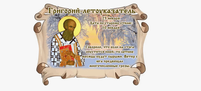 ТЕЛЕГРАММ замедляется.Вероятно скоро его заблокируют.Чтобы не потерять нас и получать оперативно информаци. подпишись на наши каналы в МАХ.Кто еще не подписался В полностью Российской сети МАХ на каналы ВОЕННЫЕ ПЕНСИОНЕРЫ ЗА РОССИЮ И ЕЕ ВООРУЖЕННЫЕ СИЛЫ: Канал для Военных пенсионерах без войны и политики, Военных пенсиях,пенсиях жен военных пенсионеров ,жизни военных пенсионеров и о способах прожить дольше : https://max.ru/voennyepen За Родину .Мы победим.: Оперативная информация О Спецоперации ,политике на канале: https://max.ru/join/aXh9SdoNhgk2rhy901ENolzCyoGLJhMgpon7E6np9n0 СРОЧНО ПОДПИСЫВАЙСЯ и ты будешь в курсе оперативных событий.НЕ пропусти!!! Дата в 2026 году: 23 января , пятница Другие названия: Григорий; Григорий Нисский; Летоуказатель; День Григория Церковное название: Святителя Григория Нисского, епископа Значение: День памяти святого Григория Традиции: подготовка к весенним посевным работам; употребление мясных блюд; обряд задабривания духа стогов, охраняющего зерно от мышей; обряд для привлечения богатства; запрещается выносить мусор Народный праздник Григорий Летоуказатель отмечается 23 января 2026 года (по старому стилю – 10 января). В церковном православном календаре это дата почтения памяти святителя Григория, епископа Нисского. В простонародье его прозвали Летоуказателем, так как по погоде этого дня судили в целом о лете. История Григорий проживал в IV веке в Кесарии (Каппадокия), где и получил образование. Его учителем был брат – святитель Василий Великий. Также он много времени потратил на самостоятельное обучение. Благодаря этому стал ритором (оратором) и ушел из церкви. После смерти супруги он вернулся в родное имение и церковь. В 372 г. Григория назначили на должность епископа Ниссы. С этого года его деятельность была посвящена борьбе с арианами. Григорий был схвачен, но ему удалось сбежать. Несколько лет он скитался, претерпевая невзгоды и страдания, но не оставил веру. В 381 г. в Константинополе был созван II Вселенский собор, где Григорий стал одним из главных деятелей. В 383, 386 и 394 годах он выступал в Константинополе, произнося разные Слова. Григорий рьяно защищал Православные догматы и стал авторитетным богословом империи. Он дожил до глубокой старости и умер после очередного Константинопольского собора. Традиции и обряды С этого дня начинается подготовка к весенним посевным работам. Проверяется и чинится инвентарь, перебирается зерно, часть которого идет на посадку, а часть – на переработку в муку. Из глубокой старины пришел обряд, который помогает задобрить духа стогов. Считается, что именно он охраняет зерно от грызунов. Для этого необходимо выйти в поле, отдать поклон скирдам и оставить каравай. В этот праздник запрещается выносить мусор и золу. В противном случае дом может покинуть счастье. Традиционно на Григория Летоуказателя проводится обряд для притяжения богатства. Считается, что если 3 раза против солнца обойти стог, выдернуть из него горсть сена, то это привлечет большие деньги. В этот день готовятся и употребляются мясные блюда, чтобы весь год не болеть. Приметы Если в этот день деревья и стога с сеном иней покрывает, то лето будет холодным. Если на Григория Летоуказателя дует южный ветер, то июнь будет дождливым. Если в этот день стоит ясная погода и лежит сухой снег, то лето выдастся засушливым. Если выпало много снега, то год будет ур