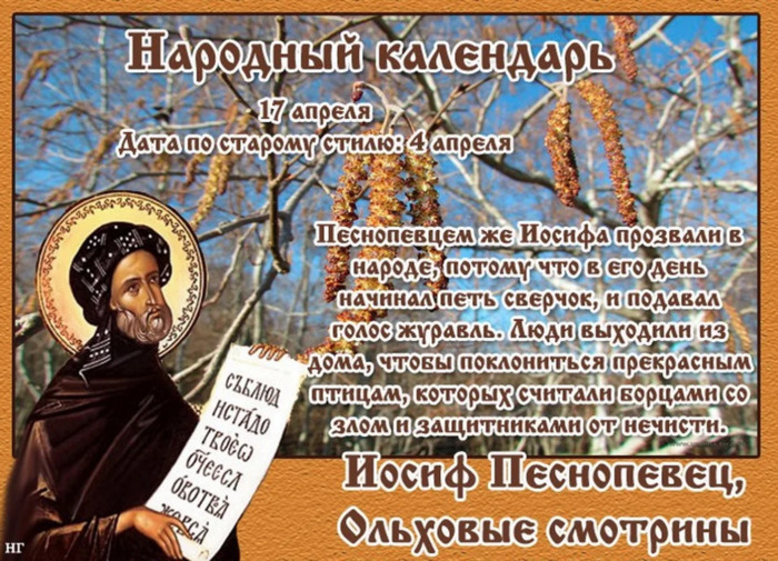 Дата в 2022 году: 17 апреля , воскресенье Другие названия: День Осипа; Иосиф; Ольховые смотрины Церковное название: Преподобного Иосифа Песнописца Значение: Чествование святого Иосифа Песнописца Традиции: Наблюдение за цветением ольхи Народный праздник Иосиф Песнопевец отмечается 17 апреля 2022 года (дата по старому стилю – 4 апреля). Православной церковью в этот день чтится память святого Иосифа Песнописца. В народе его прозвали «Песнопевцем» потому, что с этого дня подает голос сверчок и начинаются журавлиные песни. Эту птицу любят за красоту и считают не только защитником от нечистых сил и любого зла, но и настоящим предвестником весны. Название «ольховые смотрины» праздник получил за то, что с этого дня начинают наблюдать за цветением данного дерева. Особое внимание уделяют «сережкам» и шишкам. История Святой Иосиф жил в IX веке. Он был родом из Сицилии, из семьи благочестивых христиан. В 15 лет ушел жить в Фессалоникийский монастырь. Он приглянулся братьям за кроткий, трудолюбивый и набожный нрав. Вскоре его посвятили в пресвитеры. Во времена жестоких иконоборческих гонений при императоре Льве Армянине Иосиф и святой Григорий Декаполит посетили Константинополь. Они открыто исповедовали в домах христиан и на площади почитание святых образов, поддерживали православных. Вскоре Иосифу выпала честь отправиться делегатом в Рим к папе Льву III и рассказать об опасности, которая нависла над всеми православными. Во время поездки Иосифа схватили, увезли на остров Крит и продержали в заключении шесть лет. В ночь на Рождество в 820 году к нему в видении пришел Николай Мирликийский и предложил прочесть свиток, съесть и пропеть написанное. После этого кандалы сами разомкнулись на руках Иосифа. Так святой освободился и вернулся в Константинополь. Иосиф возвел церковь и монастырь в честь святого Николая. Следующую обитель святой воздвиг в честь апостола Варфоломея. Он хотел почтить его память восторженными псалмами, но таковых не нашлось. Спустя 40 дней перед ним предстал дух Варфоломея, возложил на грудь Евангелие и благословил на написание церковных песнопений. С тех пор Иосиф сочинил хвалебные песни апостолу, Божией Матери и святым угодникам. Он прожил долгую богоугодную жизнь. Умер в 883 году. Традиции и обряды На Иосифа Песнопевца смотрят, как цветет ольха. Присматривают деревья для сруба будущего колодца и для заготовки ольховой коры. Благодаря дубильным веществам, которые содержатся в ней, ольха славится умением лечить разные воспаления и останавливать кровотечения. Приметы Если на утренней заре небо желтовато-розовое, то погода в ближайшие дни будет теплой и ясной. Дует северный ветер, значит, скоро пойдут дожди. Если на ольхе много «сережек», то будет хороший урожай овса. Изобилие на дереве шишек гарантирует урожай ячменя. Если на дереве листья появились раньше, чем на березе, то летом будет много ливней. Лошадь храпит и запрокидывает голову – к скорому ненастью. Сверчок запел – пришла пора открывать пахотный сезон. | |