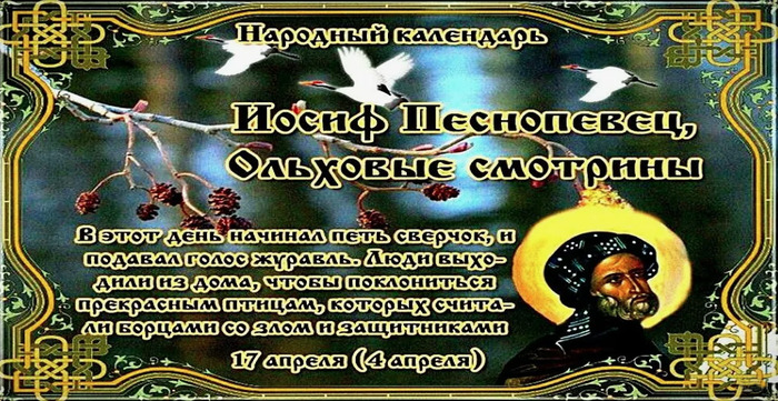 Дата в 2026 году: 17 апреля , пятница Другие названия: День Осипа; Иосиф; Ольховые смотрины Церковное название: Преподобного Иосифа Песнописца Значение: Чествование святого Иосифа Песнописца Традиции: Наблюдение за цветением ольхи Народный праздник Иосиф Песнопевец отмечается 17 апреля 2026 года (дата по старому стилю – 4 апреля). Православной церковью в этот день чтится память святого Иосифа Песнописца. В народе его прозвали «Песнопевцем» потому, что с этого дня подает голос сверчок и начинаются журавлиные песни. Эту птицу любят за красоту и считают не только защитником от нечистых сил и любого зла, но и настоящим предвестником весны. Название «ольховые смотрины» праздник получил за то, что с этого дня начинают наблюдать за цветением данного дерева. Особое внимание уделяют «сережкам» и шишкам. История Святой Иосиф жил в IX веке. Он был родом из Сицилии, из семьи благочестивых христиан. В 15 лет ушел жить в Фессалоникийский монастырь. Он приглянулся братьям за кроткий, трудолюбивый и набожный нрав. Вскоре его посвятили в пресвитеры. Во времена жестоких иконоборческих гонений при императоре Льве Армянине Иосиф и святой Григорий Декаполит посетили Константинополь. Они открыто исповедовали в домах христиан и на площади почитание святых образов, поддерживали православных. Вскоре Иосифу выпала честь отправиться делегатом в Рим к папе Льву III и рассказать об опасности, которая нависла над всеми православными. Во время поездки Иосифа схватили, увезли на остров Крит и продержали в заключении шесть лет. В ночь на Рождество в 820 году к нему в видении пришел Николай Мирликийский и предложил прочесть свиток, съесть и пропеть написанное. После этого кандалы сами разомкнулись на руках Иосифа. Так святой освободился и вернулся в Константинополь. Иосиф возвел церковь и монастырь в честь святого Николая. Следующую обитель святой воздвиг в честь апостола Варфоломея. Он хотел почтить его память восторженными псалмами, но таковых не нашлось. Спустя 40 дней перед ним предстал дух Варфоломея, возложил на грудь Евангелие и благословил на написание церковных песнопений. С тех пор Иосиф сочинил хвалебные песни апостолу, Божией Матери и святым угодникам. Он прожил долгую богоугодную жизнь. Умер в 883 году. Традиции и обряды На Иосифа Песнопевца смотрят, как цветет ольха. Присматривают деревья для сруба будущего колодца и для заготовки ольховой коры. Благодаря дубильным веществам, которые содержатся в ней, ольха славится умением лечить разные воспаления и останавливать кровотечения. Приметы Если на утренней заре небо желтовато-розовое, то погода в ближайшие дни будет теплой и ясной. Дует северный ветер, значит, скоро пойдут дожди. Если на ольхе много «сережек», то будет хороший урожай овса. Изобилие на дереве шишек гарантирует урожай ячменя. Если на дереве листья появились раньше, чем на березе, то летом будет много ливней. Лошадь храпит и запрокидывает голову – к скорому ненастью. Сверчок запел – пришла пора открывать пахотный сезон. | |