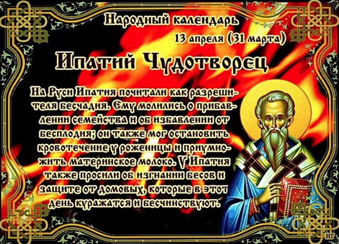 Дата в 2022 году: 13 апреля , среда Другие названия: Ипатий; Ипатий-разрешитель бесплодства и бесчадия; Канун Пролетья; Огнище Церковное название: Священномученика Ипатия, епископа Гангрского Значение: Почтение памяти святого Ипатия – епископа города Гангры Традиции: Обряд пронесения через полевые костры больных и сельскохозяйственного инвентаря; защита от проникновения злого духа Народный праздник Ипатий Чудотворец отмечается 13 апреля 2022 года (по старому стилю – 31 марта). В православном церковном календаре это дата почтения памяти святого мученика Ипатия, епископа Гангрского. История Ипатий жил в III-IV веках. Он был христианским епископом города Гангры в Пафлагонии (район на севере Малой Азии). Принимал участие в Первом Никейском Соборе (325 г.), который созвал император Константин I. Собрание проходило в городе Никее более двух месяцев. На нем осудили арианскую ересь. В 326 году епископ возвращался в свою епархию из Константинополя. По дороге на него напали. Место было пустынным. Поэтому никто не мог помочь Ипатию. Нападавшими оказались приверженцы раскольников христианской веры. Они искололи его тело кольями и мечами, после чего сбросили умирающего мужчину в болото. Ипатий молился за своих убийц до тех пор, пока женщина-арианка не нанесла ему смертельный удар камнем по голове. Тело спрятали в пещере, но его удалось найти. Жители с почестями похоронили останки епископа. После кончины мощи святого Ипатия восславились многими чудесами, среди которых – излечение от разных недугов и изгнание бесов. Традиции и обряды Святой Ипатий помогает при бесплодии, трудной беременности, угрозе выкидыша, если открылось кровотечение или возникли трудности со вскармливанием грудничка. В этот народный праздник молятся ему и просят у него помощи в решении данных проблем. Существует поверье, что святой также защищает от любой нечистой силы. К нему обращаются и по этому поводу. 13 апреля возрастает вероятность подвергнуться проникновению злого духа. С целью защиты нужно начертить кресты на окнах и дверях, разложить чертополох и не произносить слово «бес» и тем более «черт». Родившаяся 13 апреля женщина зовется «огнищанкой». В день своего рождения она должна взять горящие угли из печи и отнести на поле (огород) и там развести костер. Эти островки огня способны излечить даже самую тяжелую и затянувшуюся болезнь. Больного нужно пронести над пламенем в этот же день. В скором времени он поправится. Также через полевые костры проносят борону, соху и другой сельскохозяйственный инвентарь. Такой обряд проводят, чтобы орудие не сломалось во время сезона и хорошо послужило хозяину. Приметы Если ветра нет, а сквозь облака видно синий небосвод, то скоро начнется ливень. Если весь день стоит ясная погода, то и лето будет таким же. Если утром прошел дождь, то летом будет частое ненастье. Солнце весь день яркое – долгое время будет стоять теплая погода. Если клен и береза выделяют сок, то вскоре потеплеет. Дым из трубы поднимается ровно вверх – жди потепления. | |